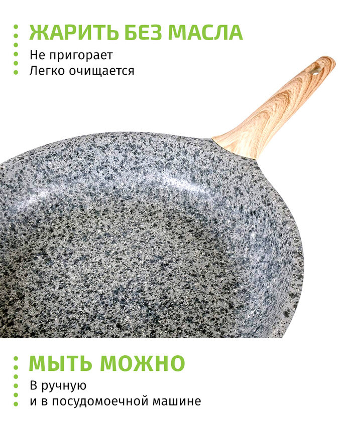 | Плюсы: | приятный на ощупь и круто выглядящий материал ручки. необычный материал покрытия сковороды.