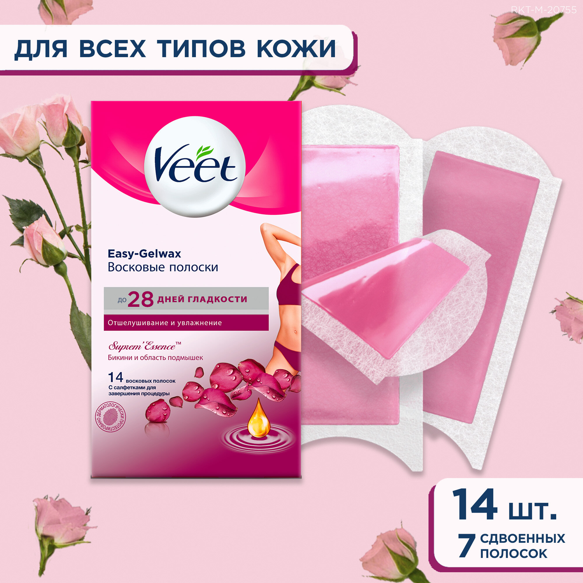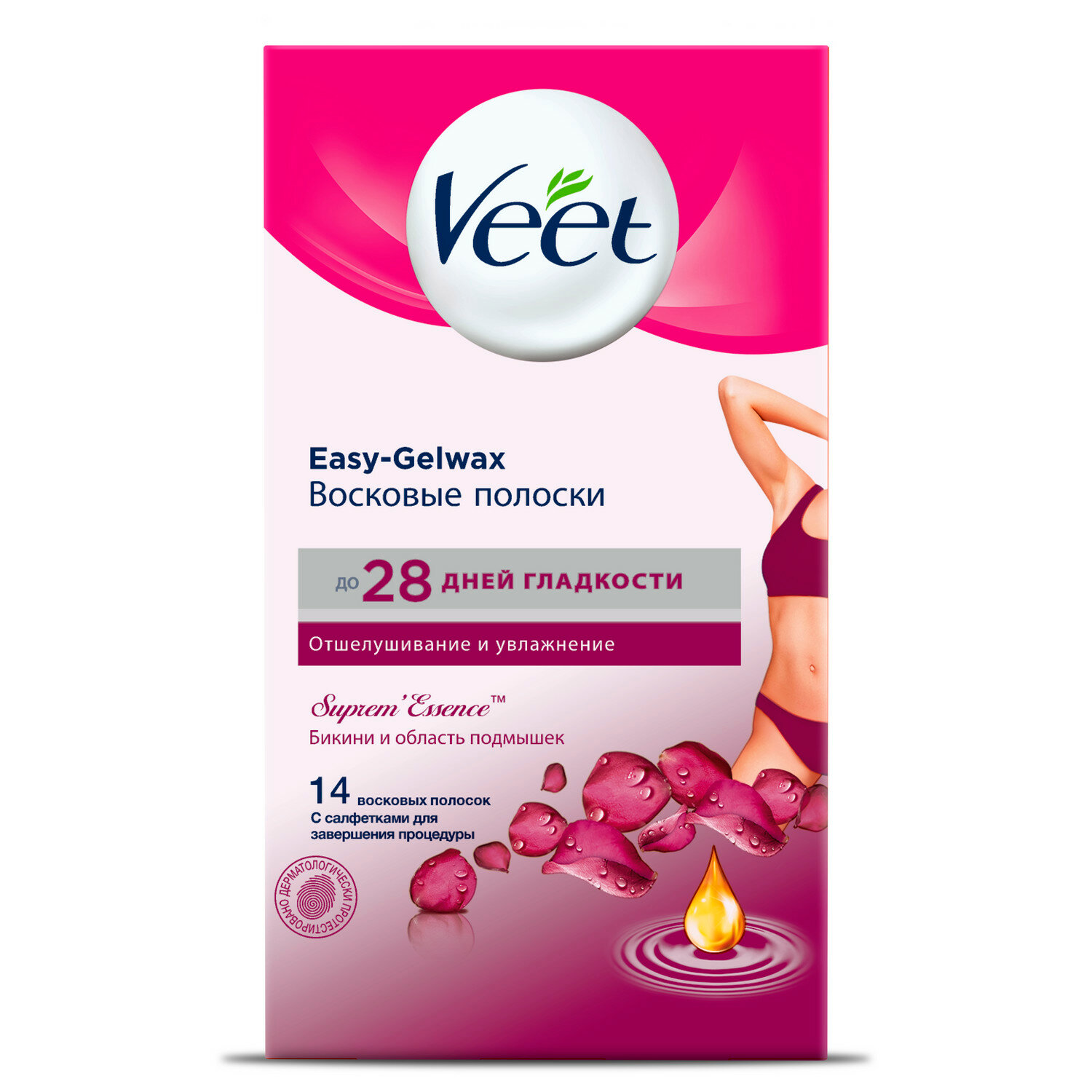 Veet восковые полоски для чувствительных участков тела (линия бикини и область подмышек) с ароматом бархатной розы и эфирными маслами c технологией easy gel-wax 14 шт.