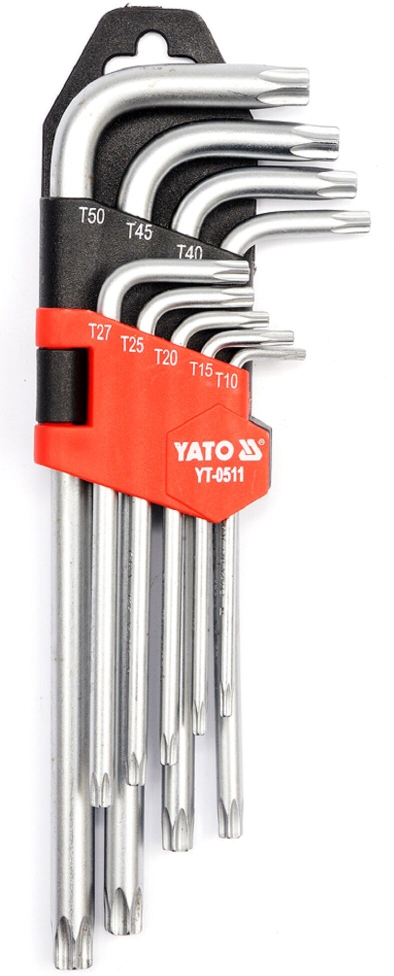 Набор ключей 9 пр: торцевых TORX Г-образных средних (L=72-174 мм) с отверстием: ТH10, ТH15, ТH20, ТH25, ТH27, ТH30, ТH40, ТH45, ТH50, в пластм. держателе YATO YT-0511 | цена за 1 шт