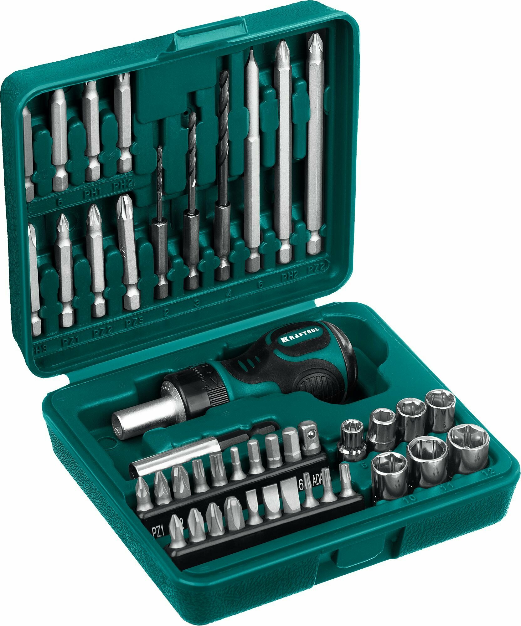 KRAFTOOL Набор KRAFTOOL Отвертка реверсивная с битами и торцевыми головками и сверлами, 43 предм