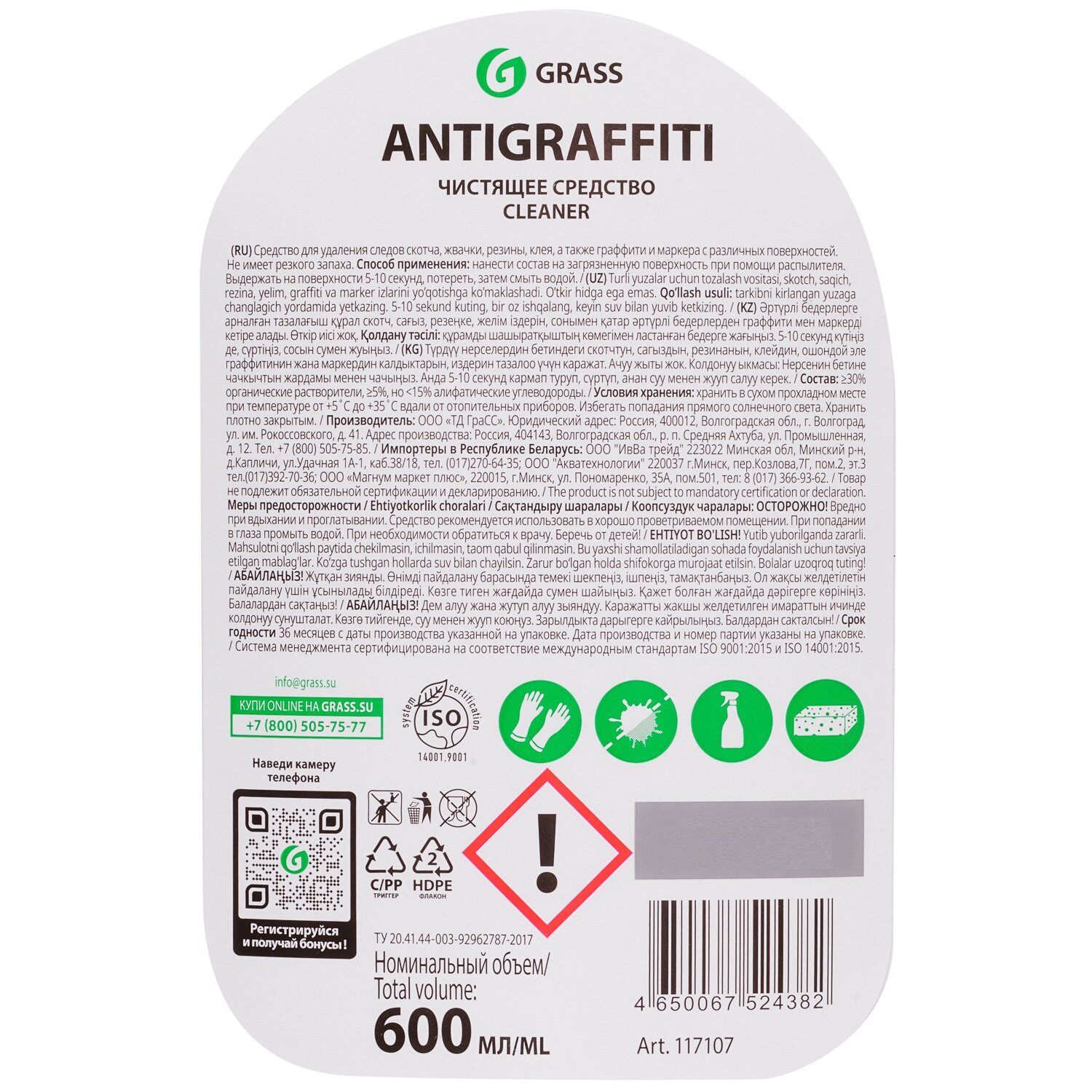 GRASS 117107 очиститель многоцелевой 600мл - antigraffiti: средство для удаления следов скотча,