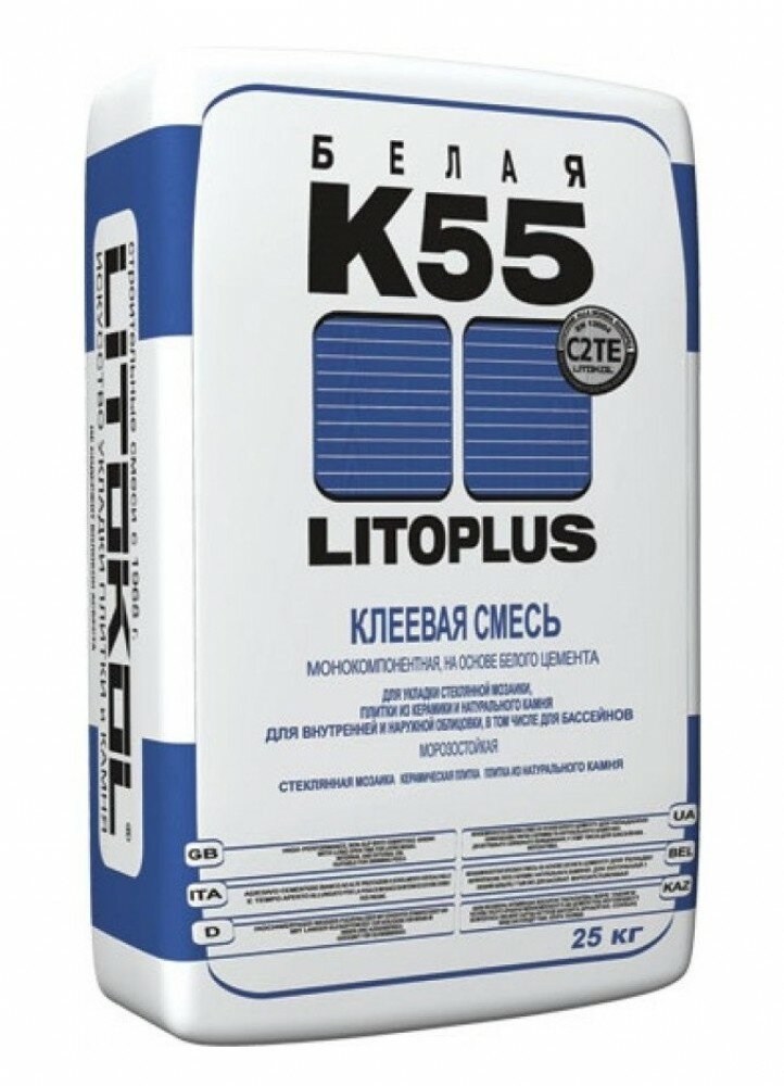 Клей для плитки/ керамогранита/ мозаики/ камня LitoPlus K55 белый (класс С2 ТЕ) 25 кг