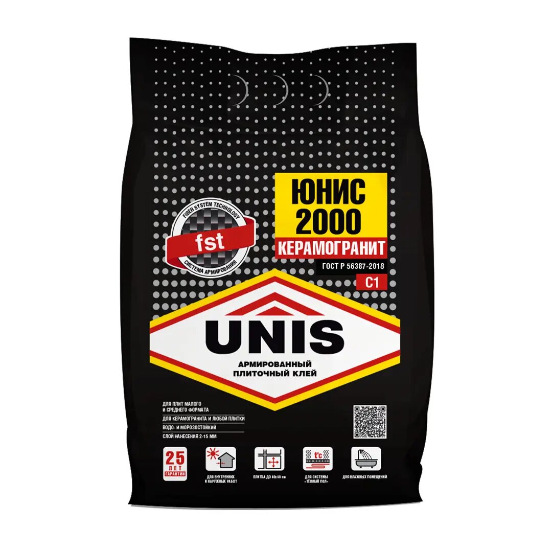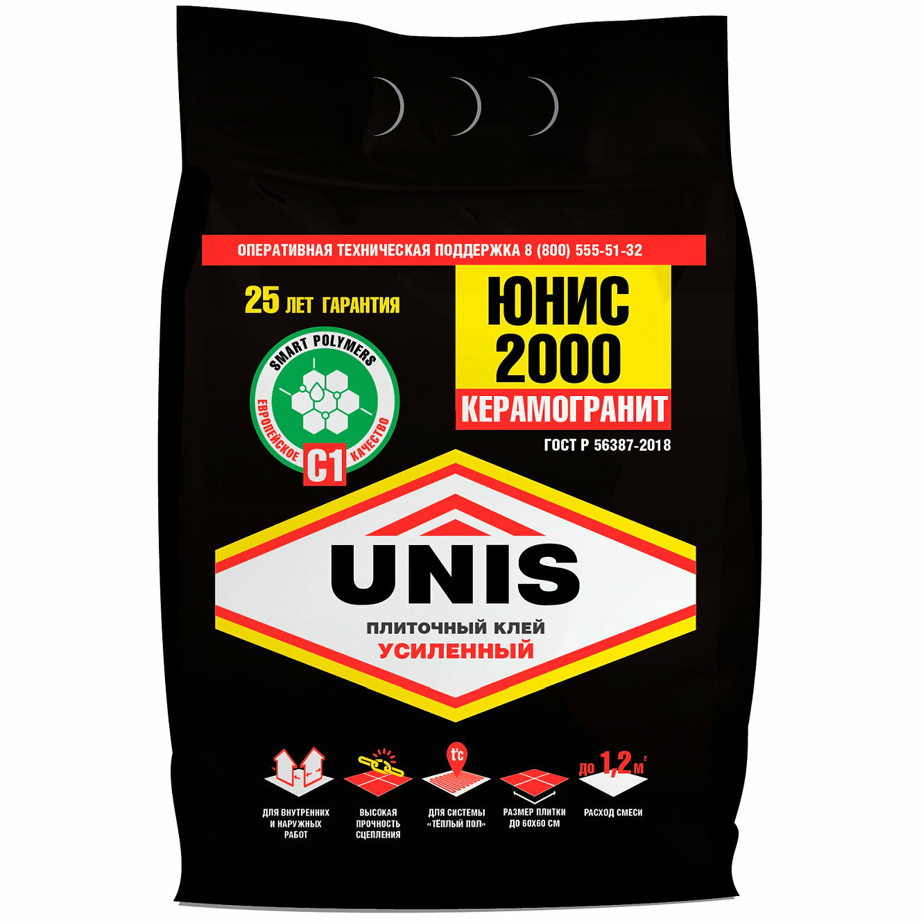 Клей Unis для плитки 2000 керамогранит 25 кг 48 черный мешок юнис (1шт) (65669)