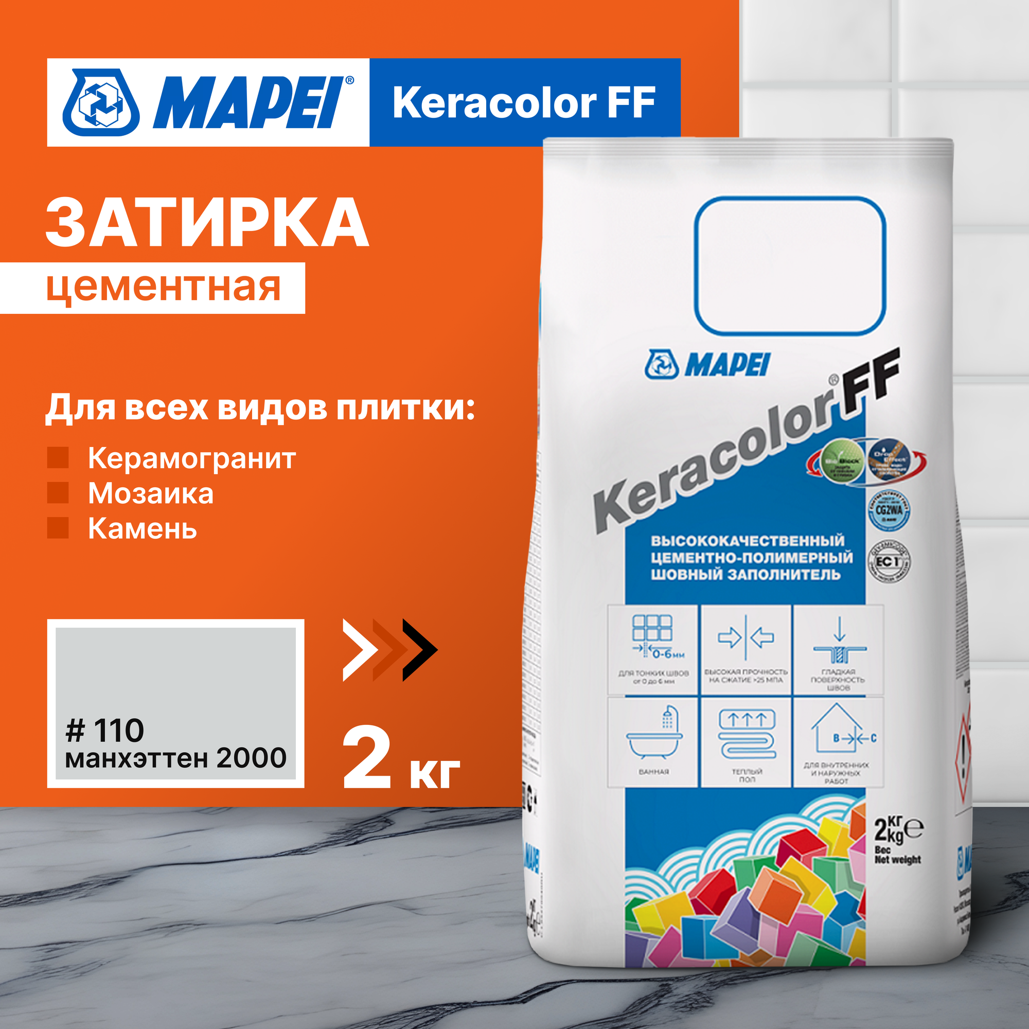 Купить Mapei Keracolor FF Цементная затирка для швов (№110 манхеттен, 2 кг)