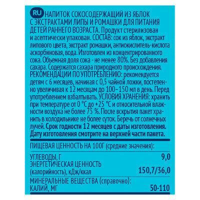 Сок яблоко-ромашка-липа для детей с 6 мес, 18х200 мл