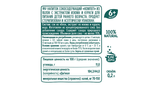 Компот фрутоняня Яблоко, изюм, курага неосветленный, с 6 месяцев, 200мл интересное: