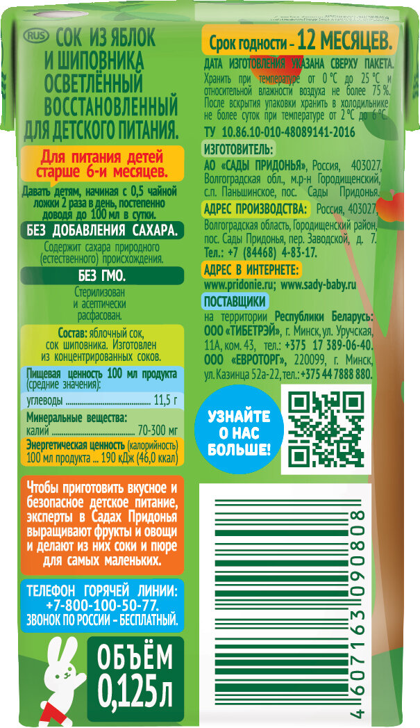 Сок сады придонья Яблоко, шиповник, с 6 месяцев, 125мл интересное: