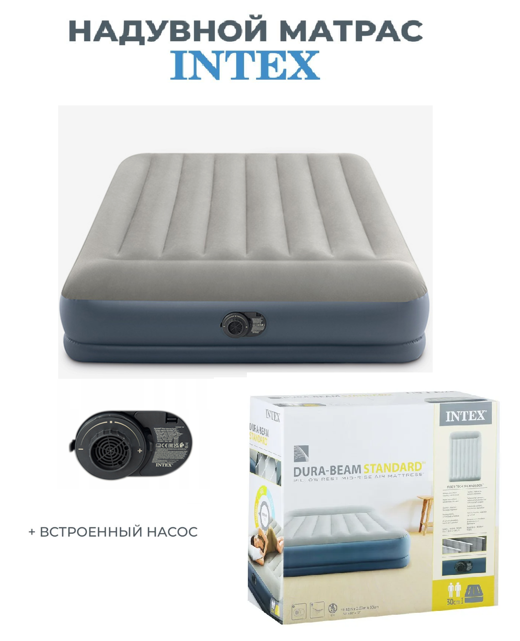 Двуспальная надувная кровать Intex 64118 Mid-Rise Airbed +насос (203х152х30см)
