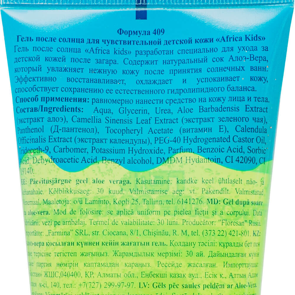 Floresan Гель после солнца детский Africa Kids, с алоэ вера, для чувствительной кожи, 200 мл