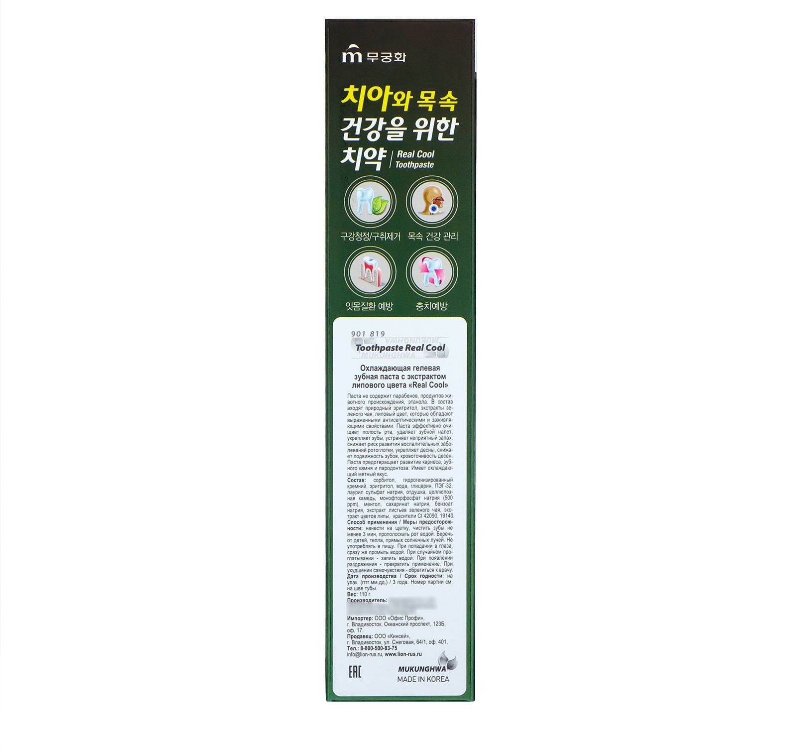 Mukunghwa Гелевая Зубная паста Real Cool Охлаждающая с экстрактом липового цвета 110гр