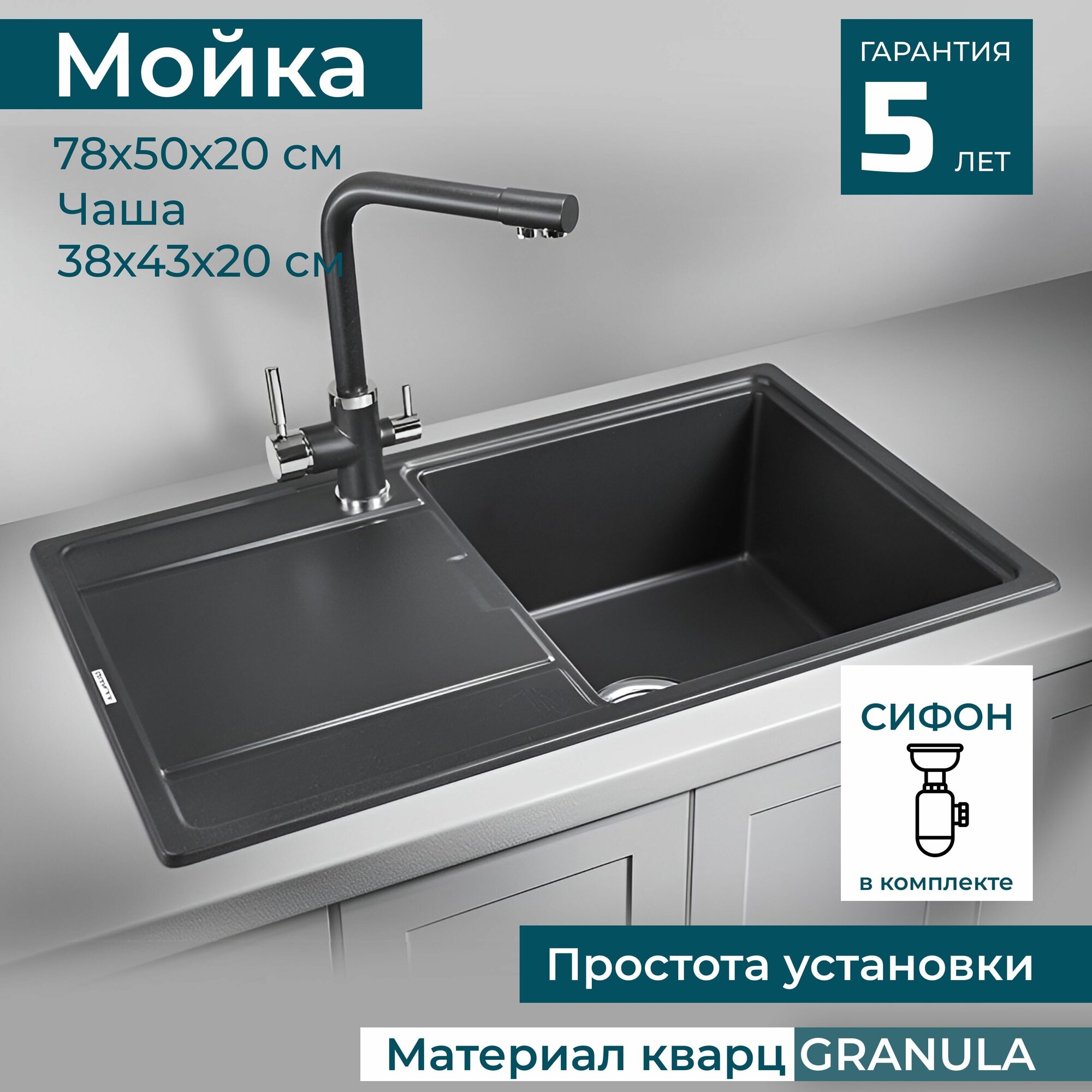 Мойка для кухни Granula 78х50х20 см врезная с крылом с сифоном кварц шварц