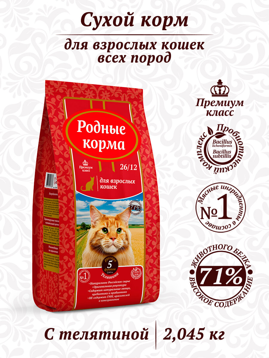 Корм сухой родные корма 26/12 5 русских фунтов для взрослых кошек, с телятиной 2,045 кг