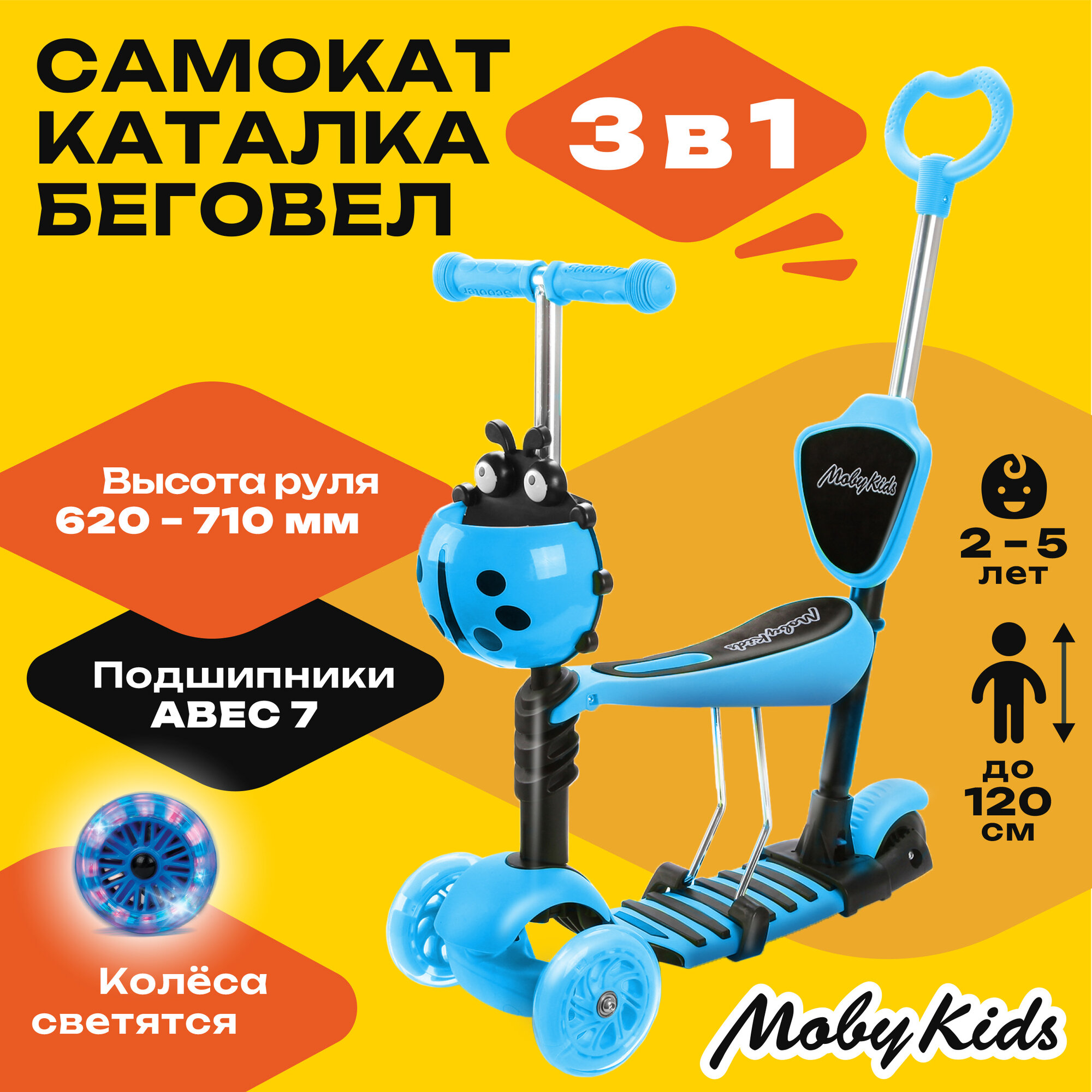 Самокат для малышей "Moby Kids Божья Коровка" 3в1 (синий) (с ручкой, светящиеся колеса)