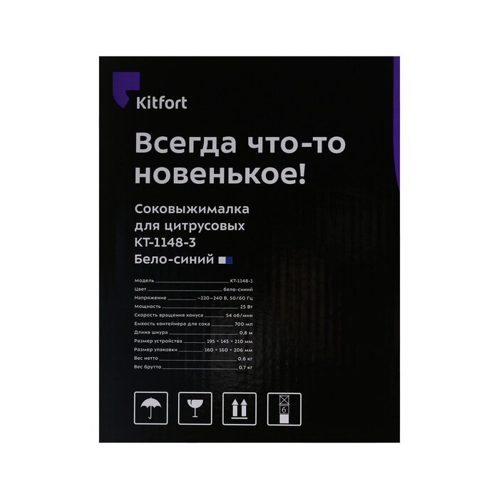 Соковыжималка Kitfort КТ-1148-3, для цитрусовых, 25 Вт, 0.7 л, 54 об/мин, бело-синяя интересное: