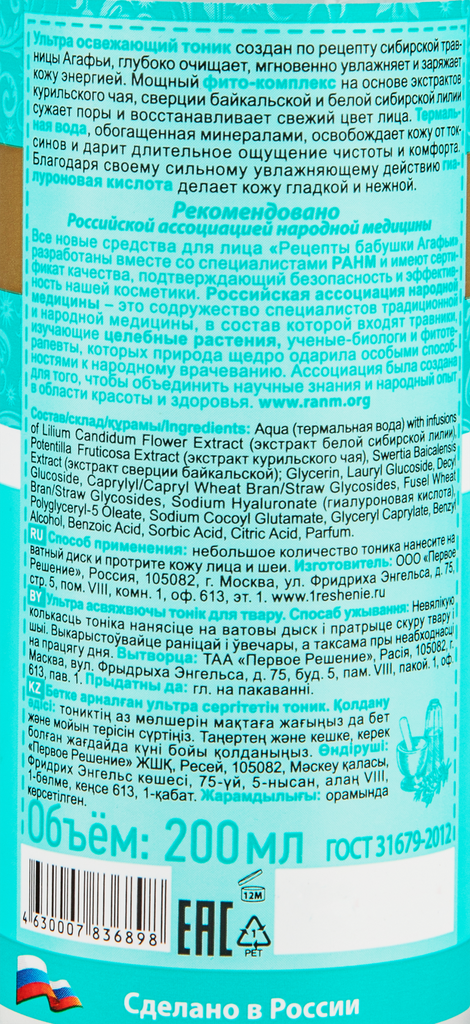 Тоник для лица Рецепты бабушки Агафьи «Ультра освежающий», 200 мл