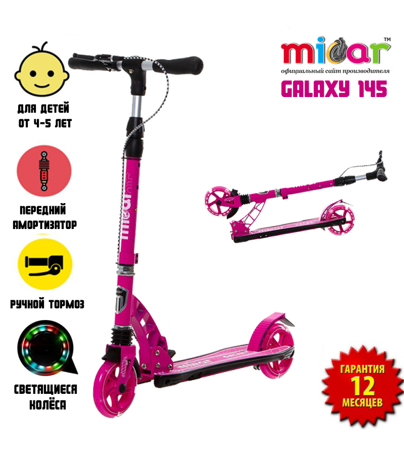 MICAR Самокат MICAR Galaxy 145 мм с ручным тормозом, передним амортизатором и светящимися колёсами 145 мм фуксия
