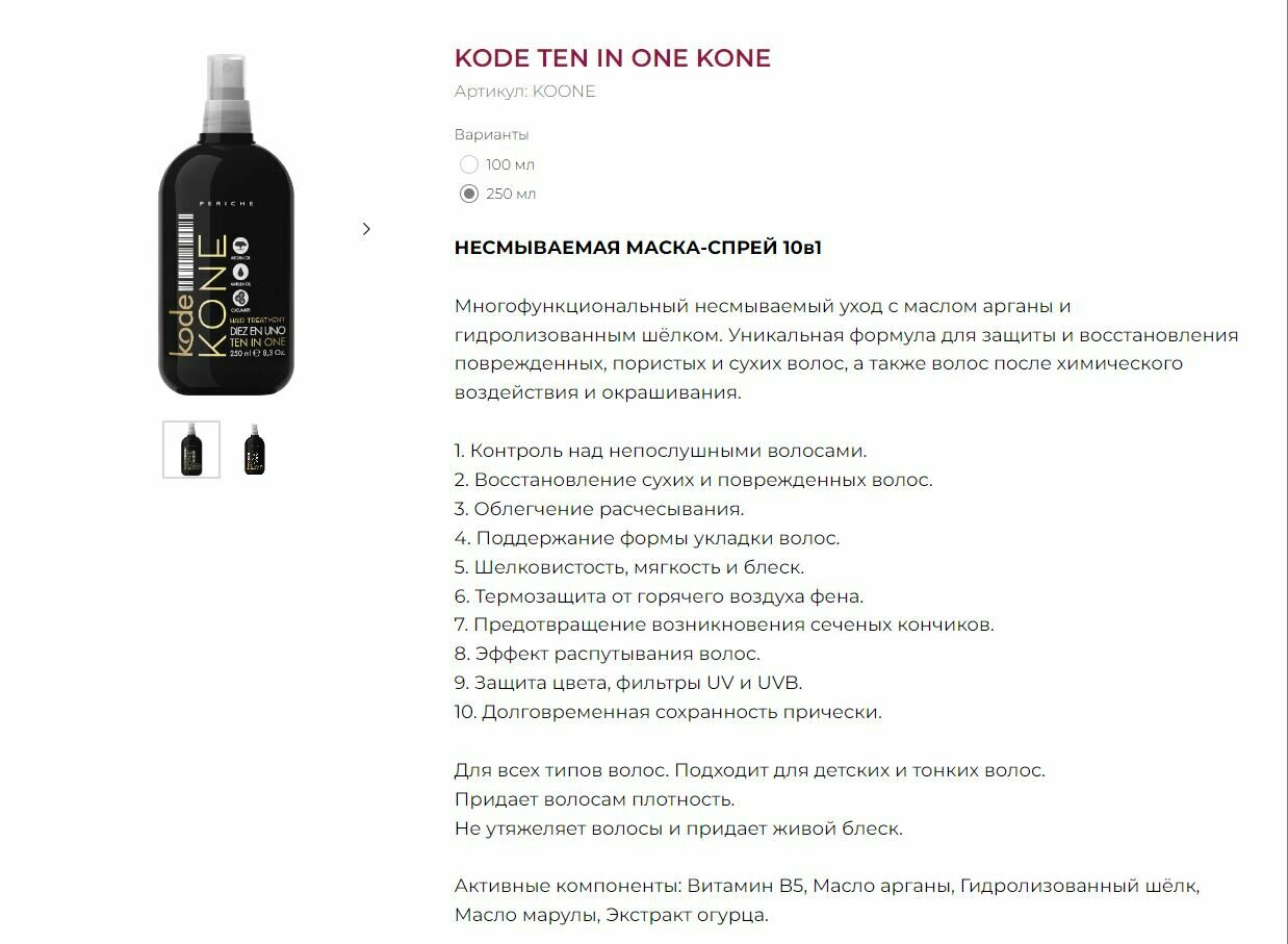 KODE Несмываемая маска-спрей KONE "10 в 1" 250мл /KONE "Ten in One"