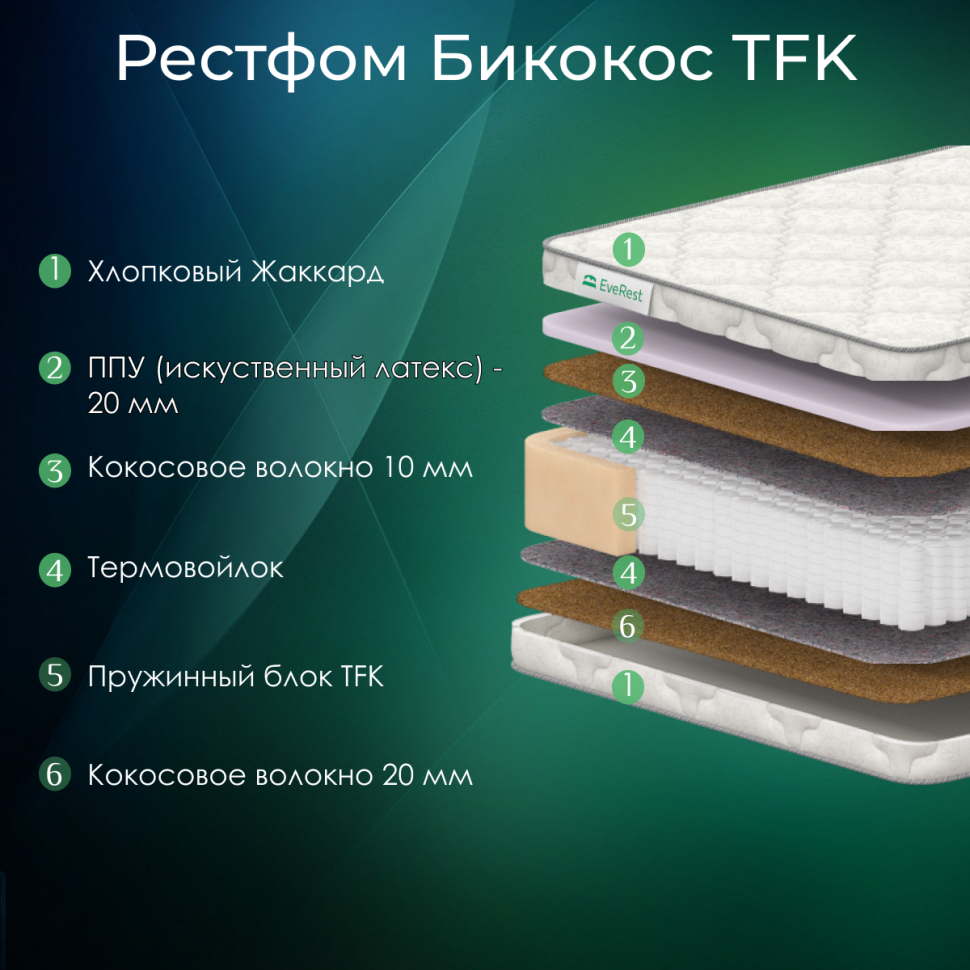 Матрас Everest Рестфом Бикокос TFK - пружинный, высота 20, чехол жаккардовый, независимые пружины ТФК, 500 пружин, с кокосом 110х200