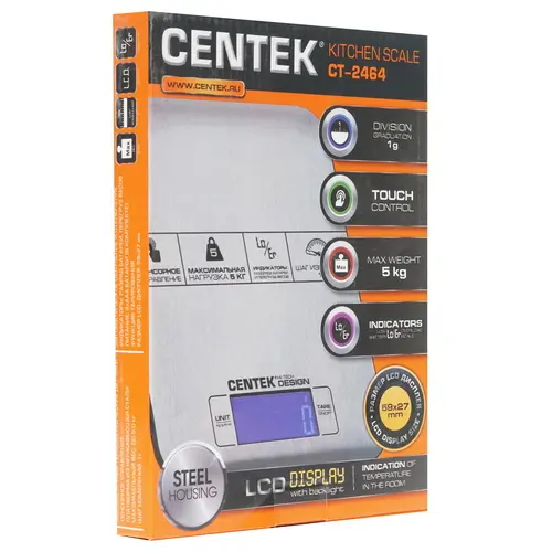 Купить Весы кухонные электронные CENTEK CT-2464: сталь, сенсор, LCD- 59х27 с подсветкой, t° в комнате, max 5кг, шаг 1г