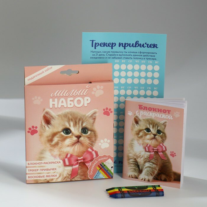 Купить ArtFox Набор: блокнот-раскраска А6, трекер привычек и восковые мелки «Котенок»