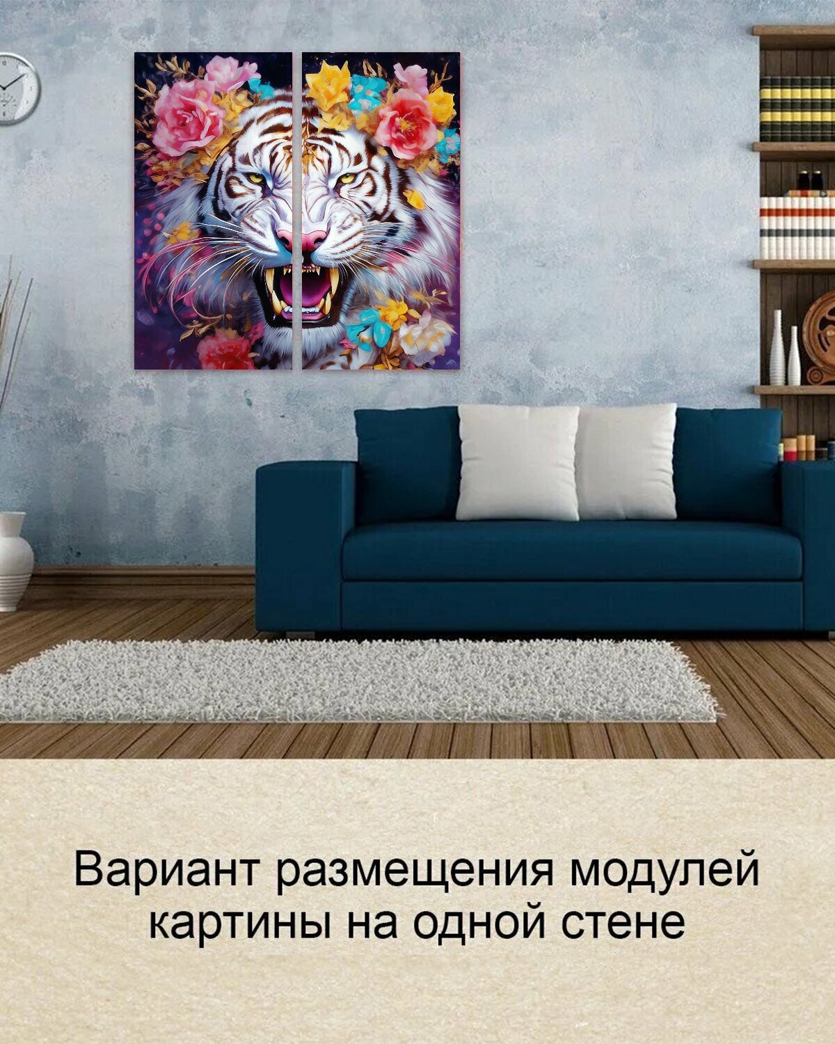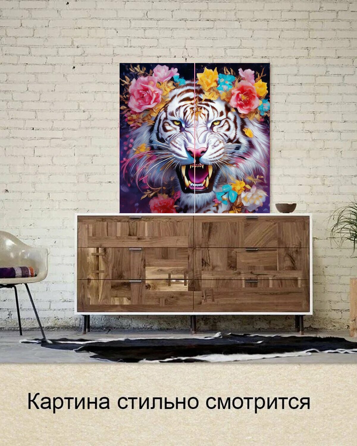 Модульная картина на ОСП Девочкам "Тигр, Белый, Красивый белый тигр, цветы , рычит" 125x125 см. 2 части для интерьера на стену интересное: