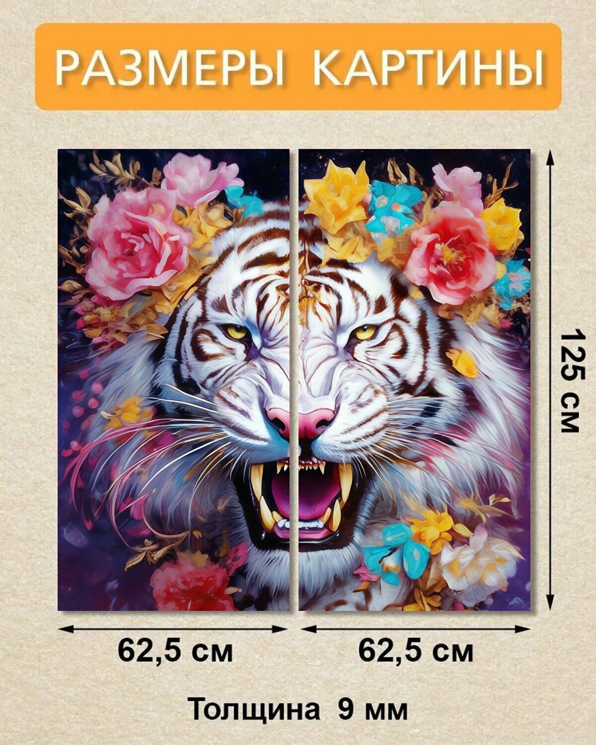 Купить Модульная картина на ОСП Девочкам "Тигр, Белый, Красивый белый тигр, цветы , рычит" 125x125 см. 2 части для интерьера на стену