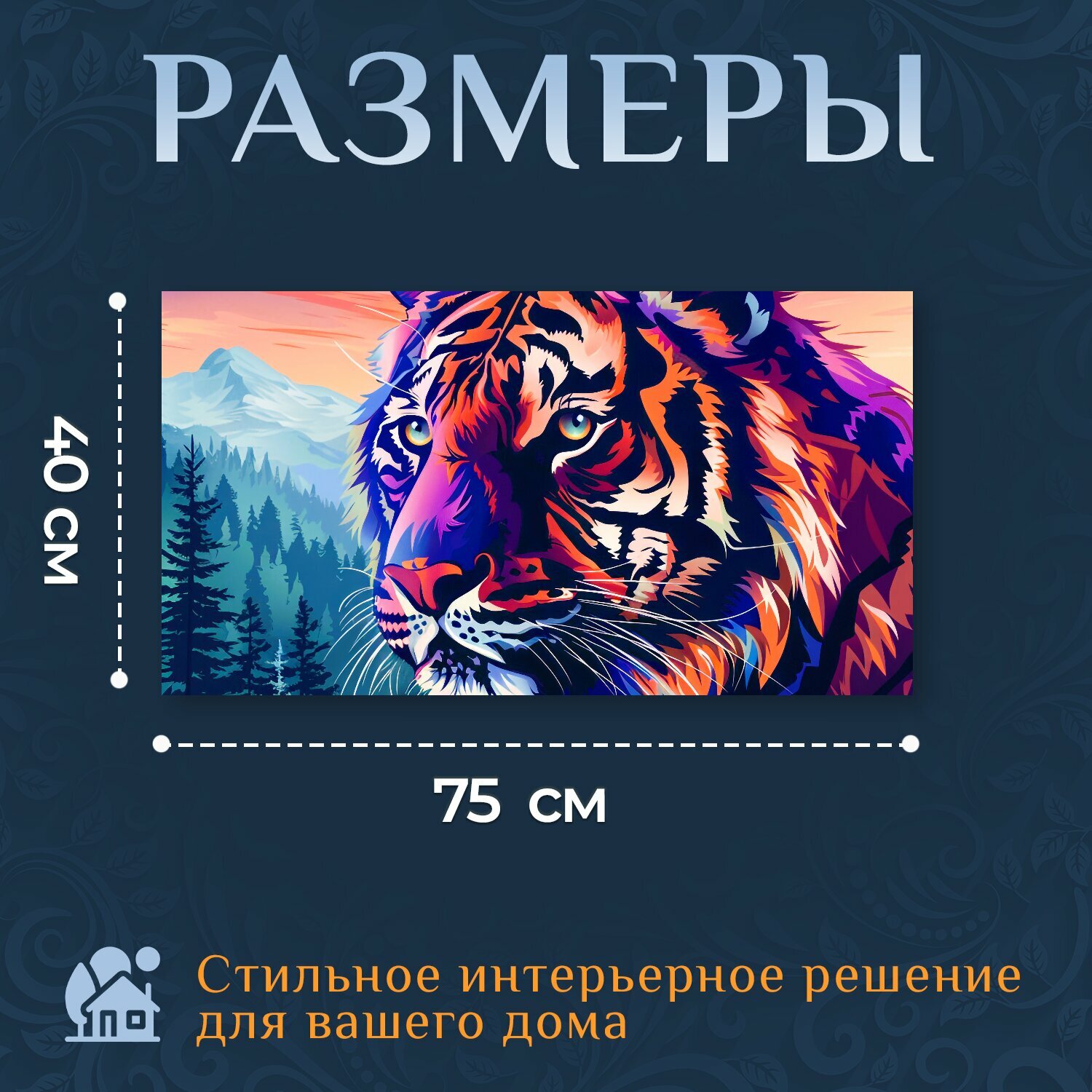 Купить Картина на холсте детям, декораторам и дизайнерам интерьеров "Любовь к дикой природе, реалистичное изображение хищника, грозный тигр на фоне горы" на подрамнике 75х40 см. для интерьера