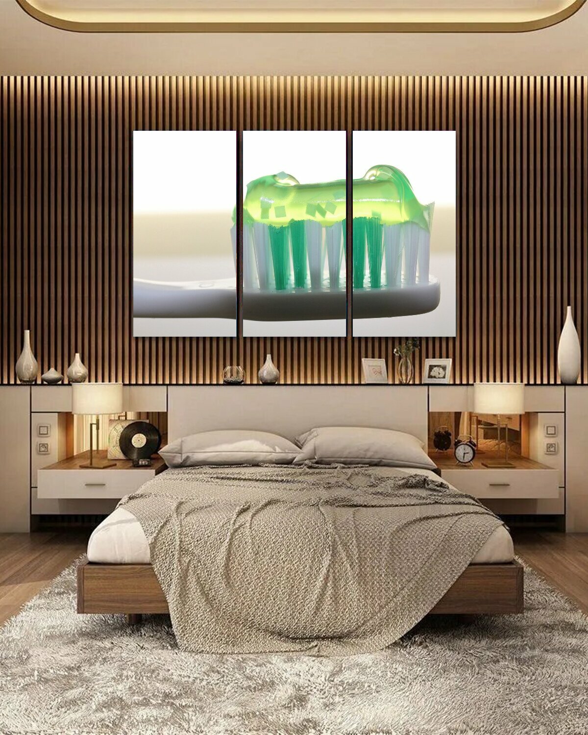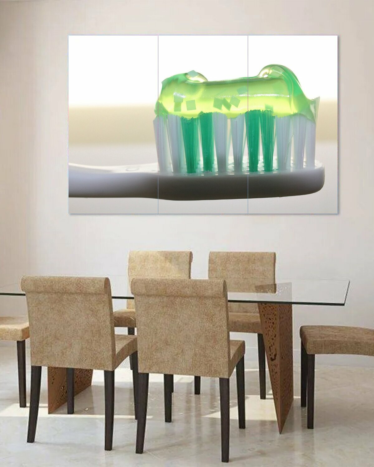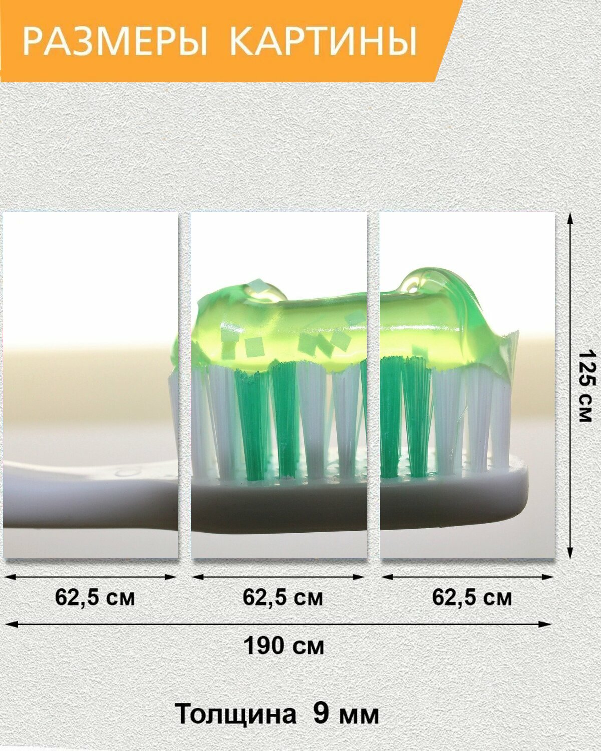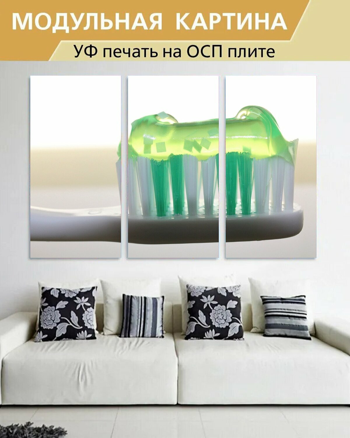 СохранитьМодульная картина на ОСП "Зубная щетка, зубная паста, стоматология" 188x125 см. 3 части для интерьера на стену интересное: