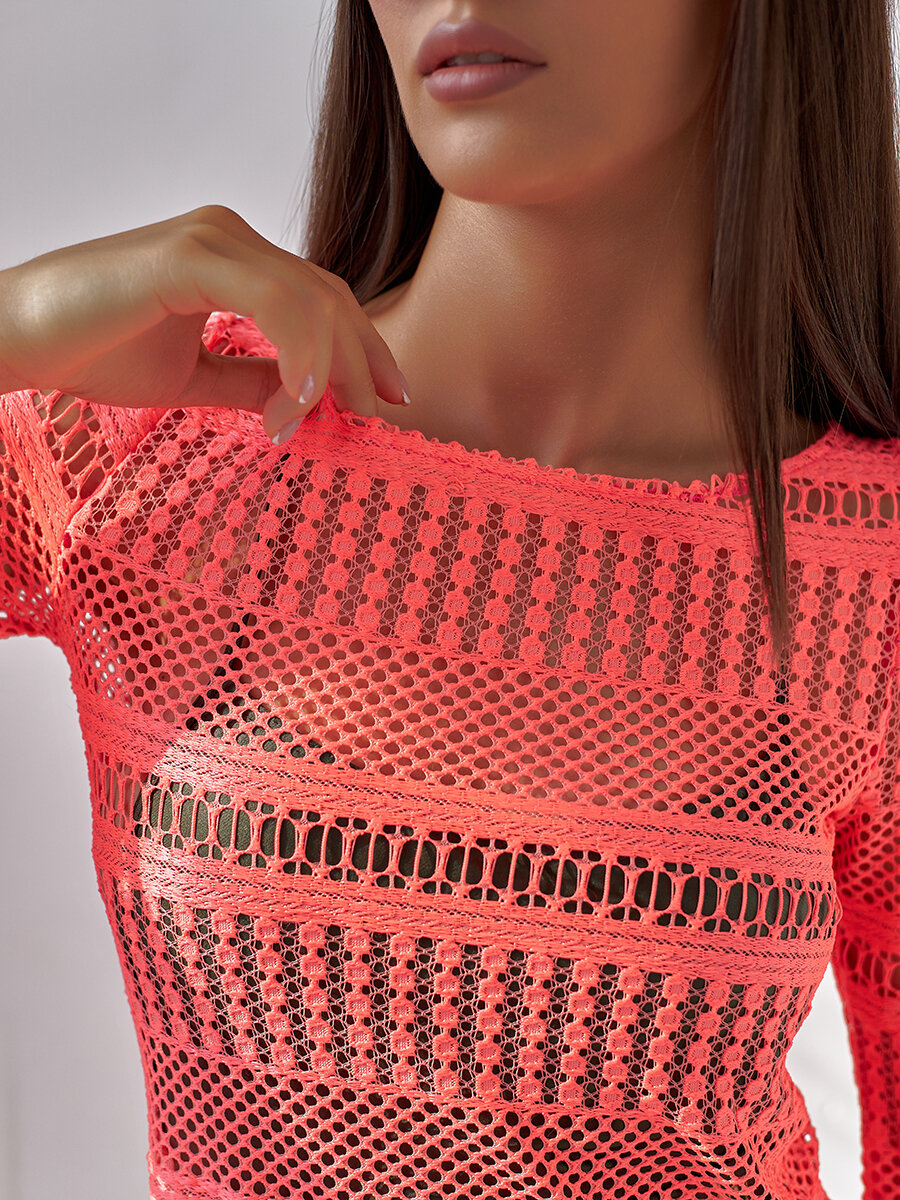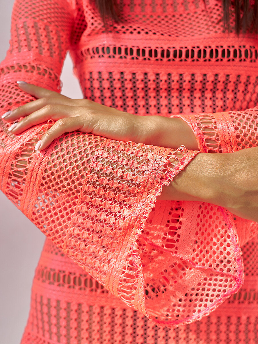 Пляжное платье туника мини горизонтальный узор с расклешёнными рукавами розовый неон р. 42