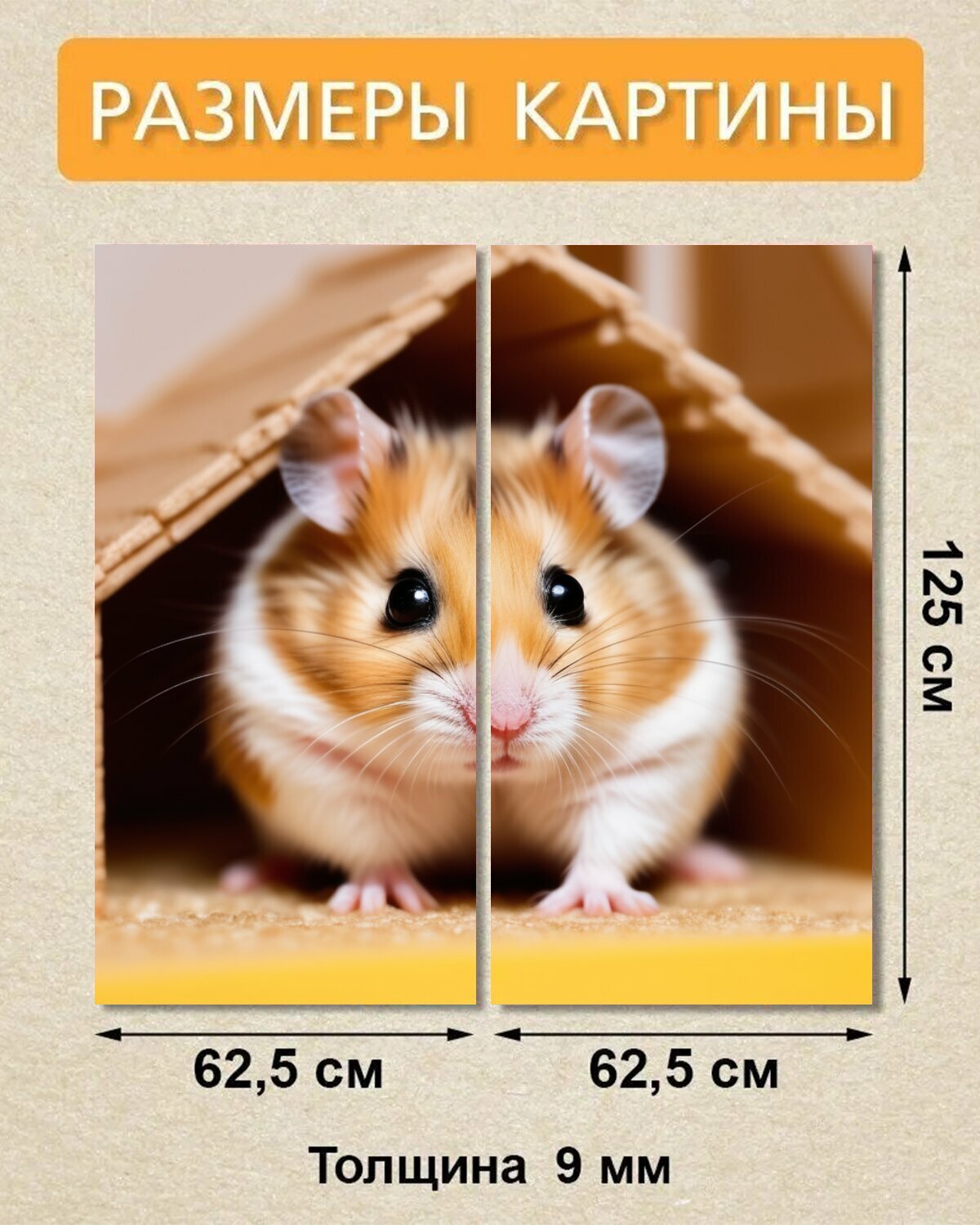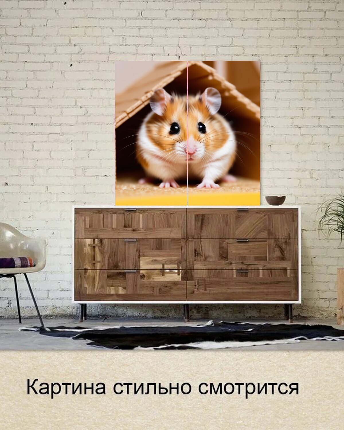 Модульная картина на ОСП для любителей животных "Домашние питомцы, хомяк, в домике" 125x125 см. 2 части для интерьера на стену интересное:
