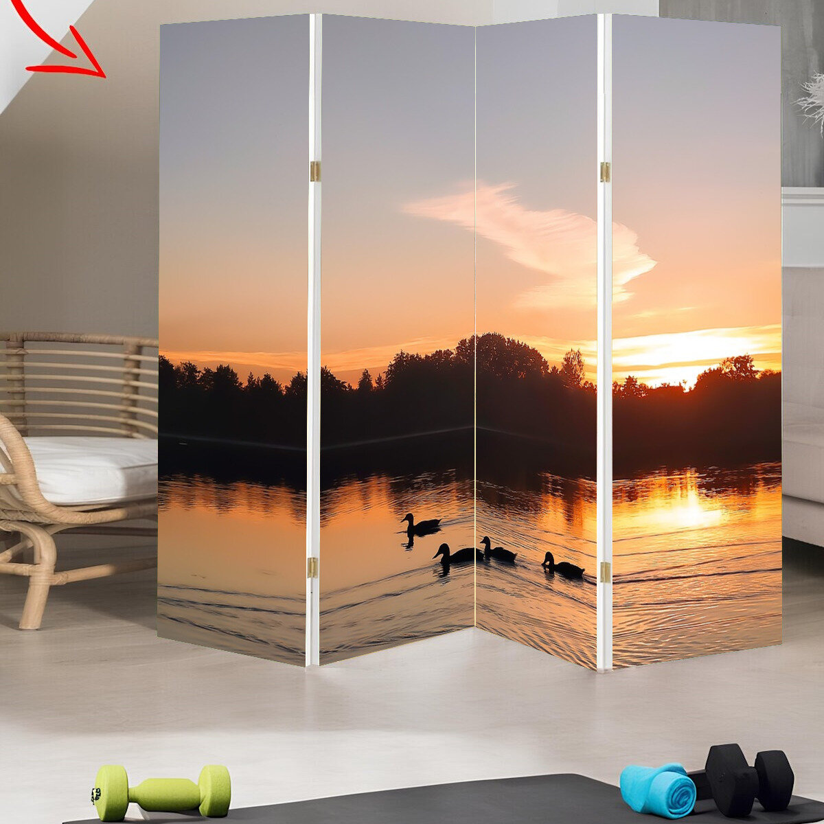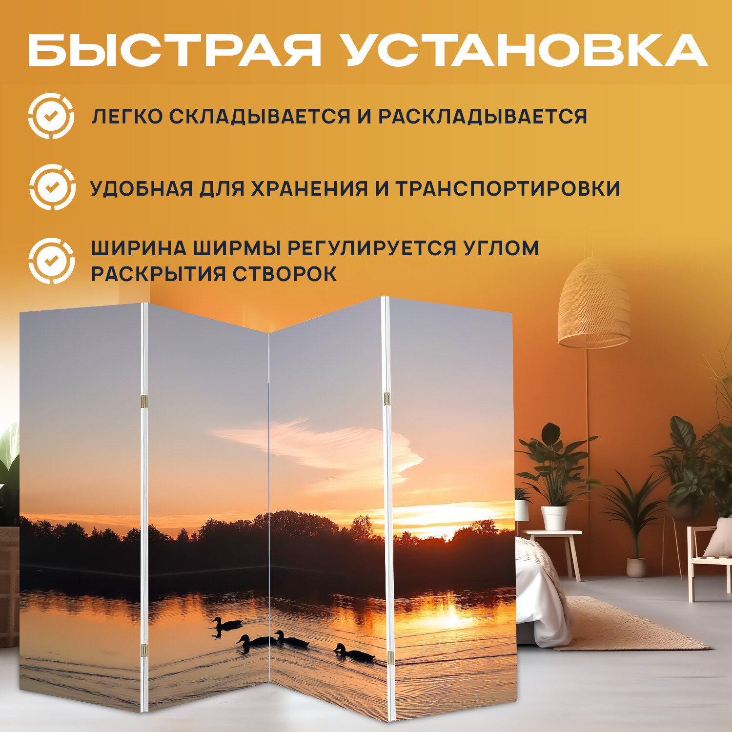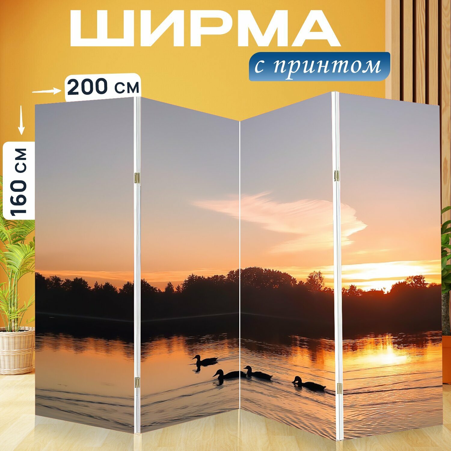 Ширма "Утки, водоплавающая птица, заход солнца" раскладная перегородка для зонирования с принтом на холсте интересное: