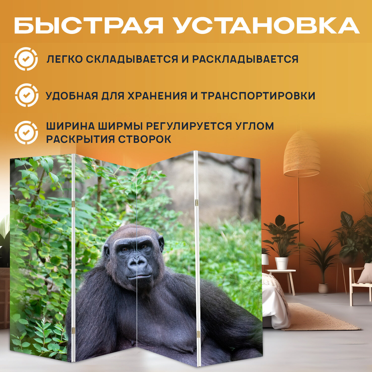 Купить Ширма "Горилла, животное, джунгли" раскладная перегородка для зонирования с принтом на холсте