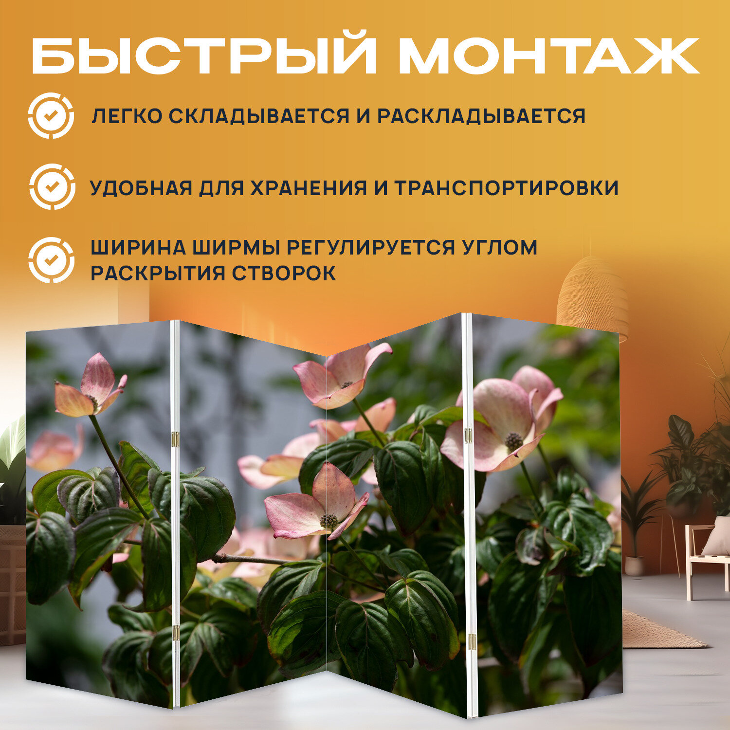 Купить Ширма "Кизил, цветы, куст" раскладная перегородка для зонирования с принтом на холсте