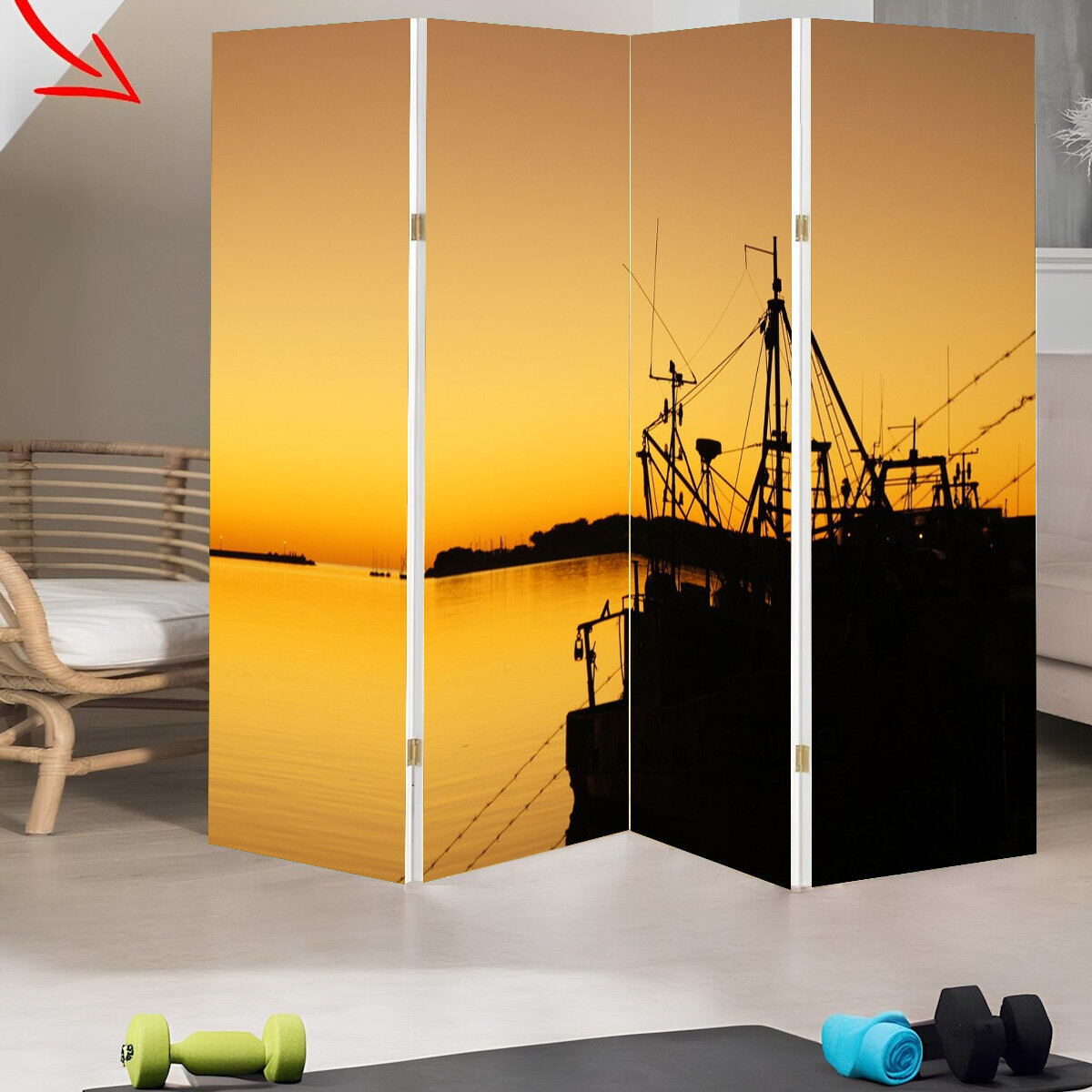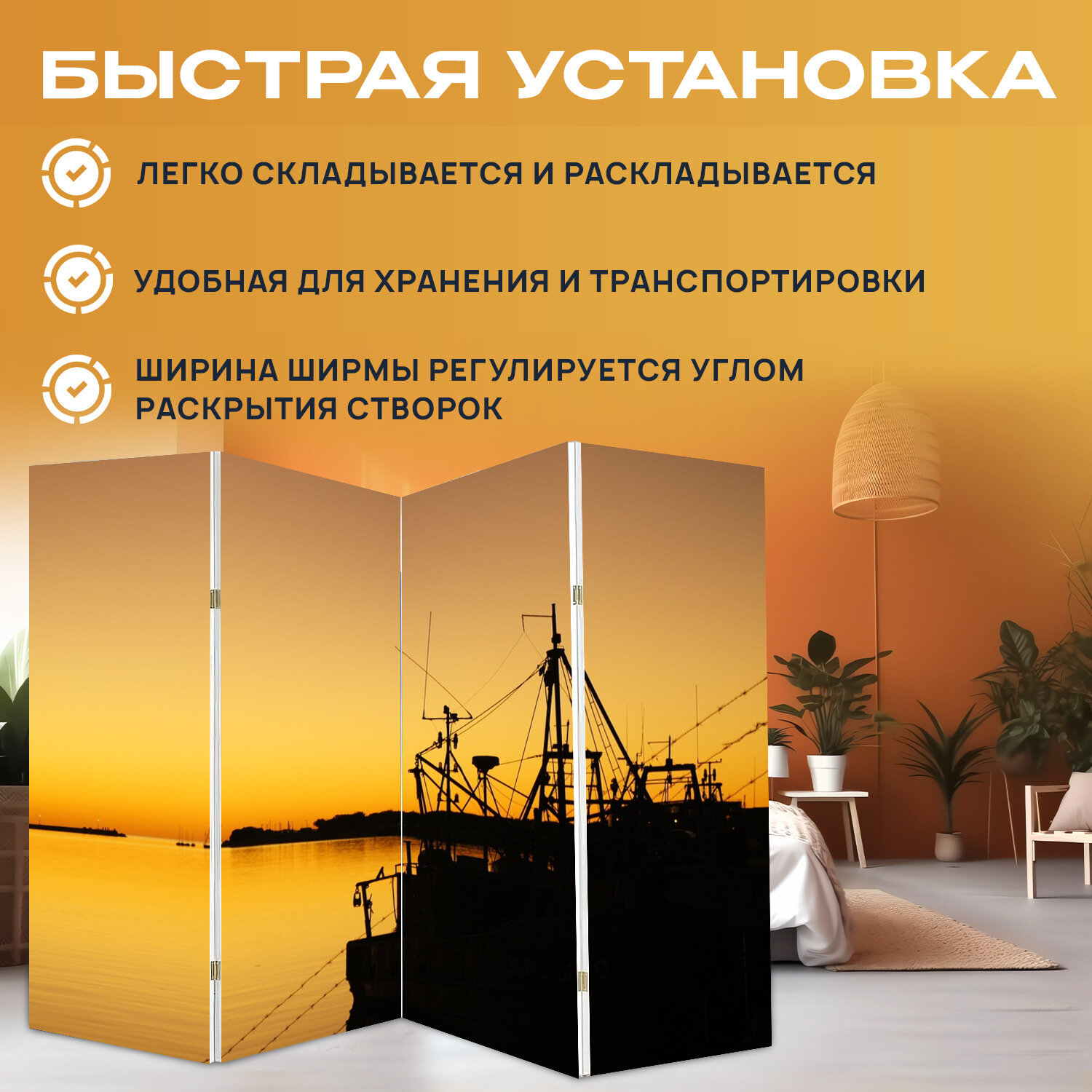 Купить Ширма "Порт, судно, море" раскладная перегородка для зонирования с принтом на холсте