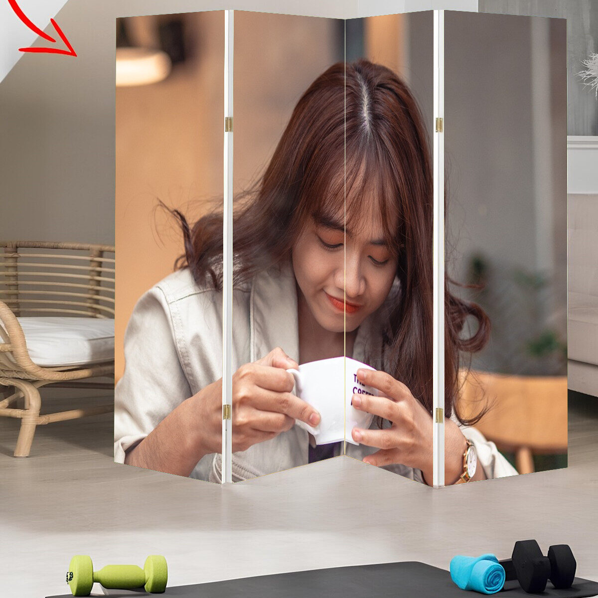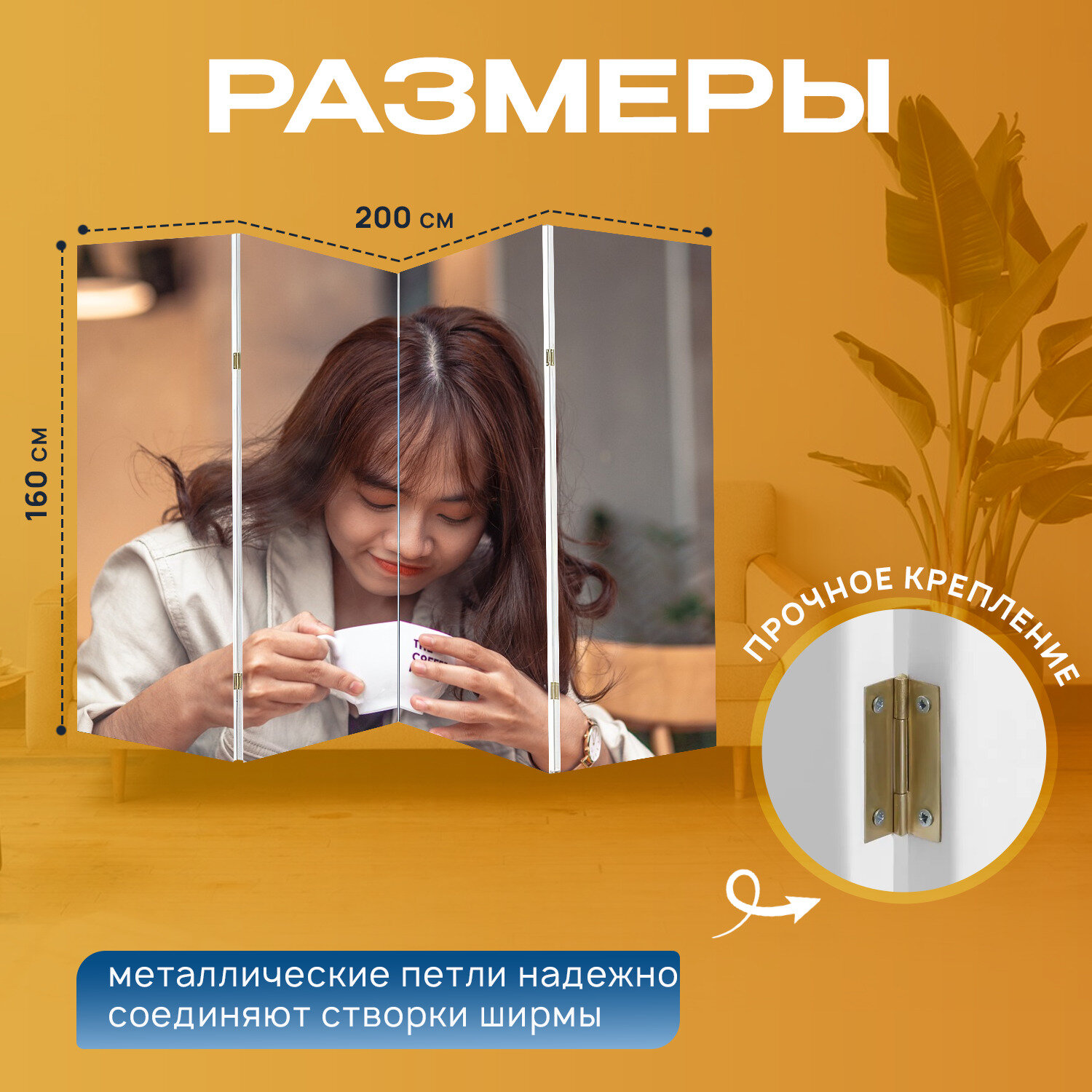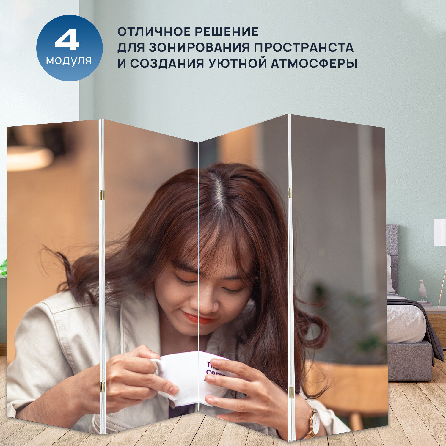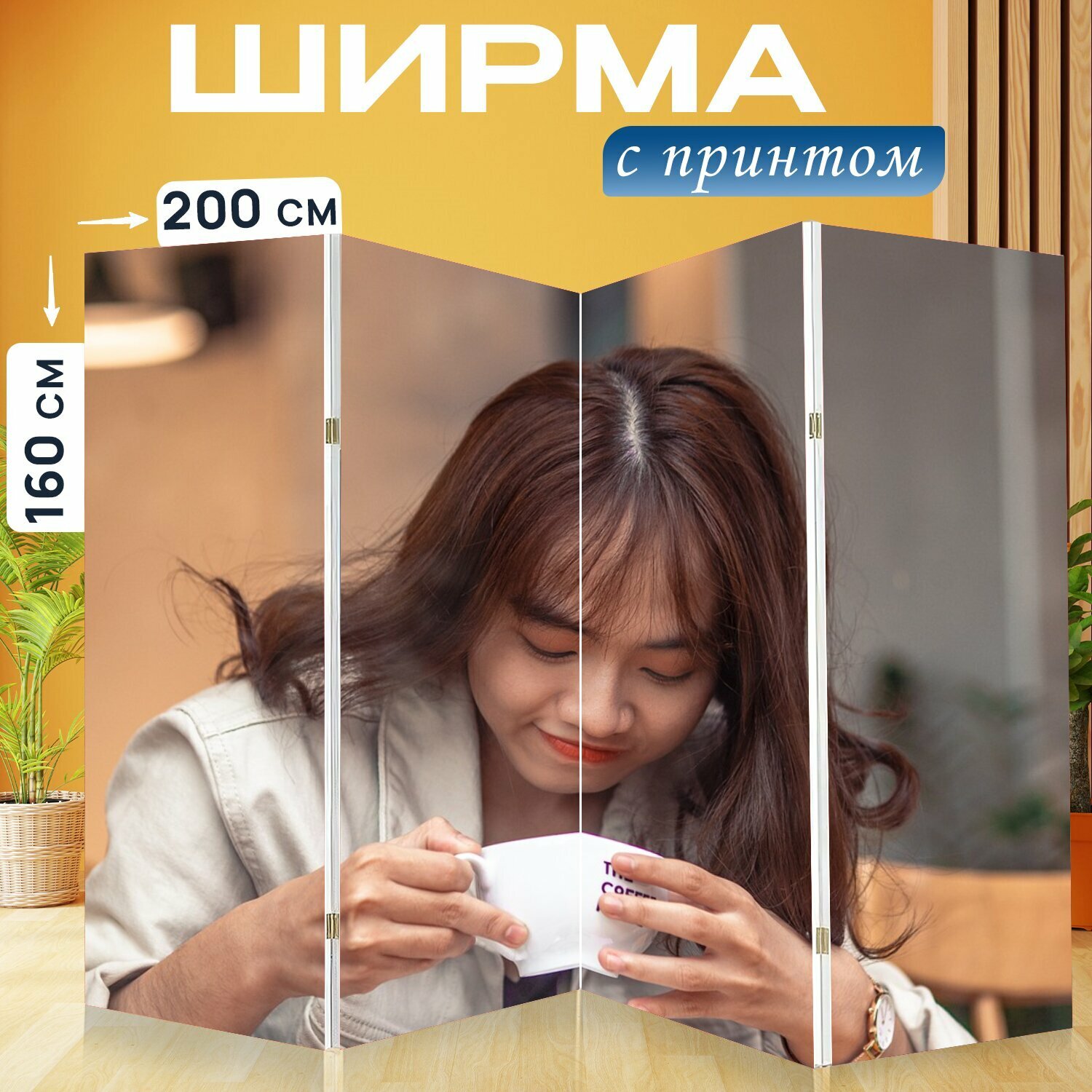 Ширма "Женщина, кафе, кофе" раскладная перегородка для зонирования с принтом на холсте интересное: