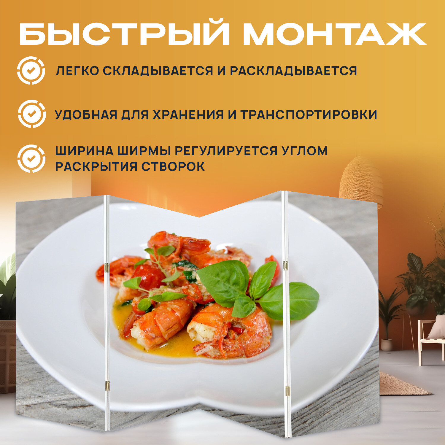 Купить Ширма "Креветки, италия, траттория" раскладная перегородка для зонирования с принтом на холсте
