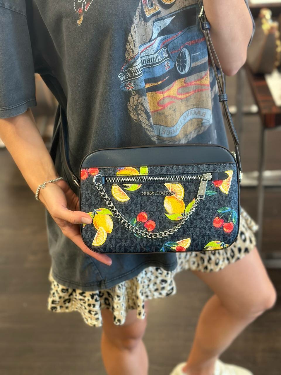 Сумка Michael Kors темно-синяя кросс-боди в монограмму с принтом "фрукты" интересное: