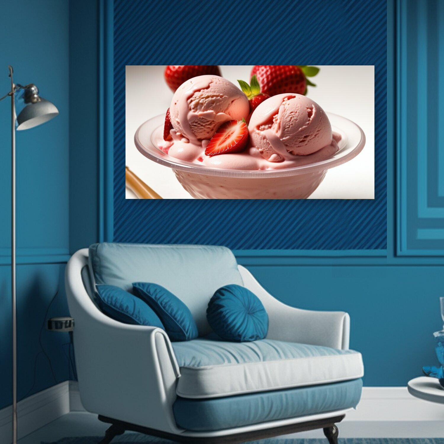 Купить Картина на холсте любителям полезного "Ягода, клубника, с мороженым " на подрамнике 75х40 см. для интерьера