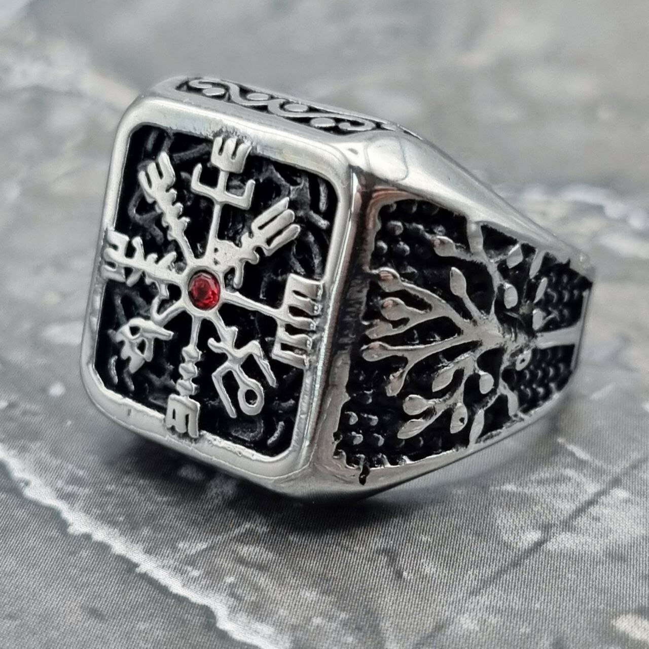Кольцо печатка из нержавеющей стали Вегвизир с красным кристаллом, мужское, цвет серебристый, 22 размер