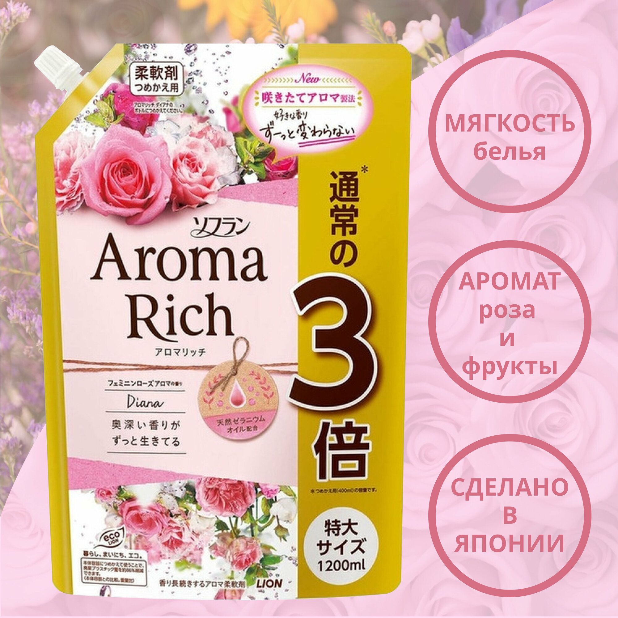 Lion soflan aroma rich diana ополаскиватель для белья дезодорирующий с натуральными ароматическими маслами, мягкая упаковка, 1200 мл