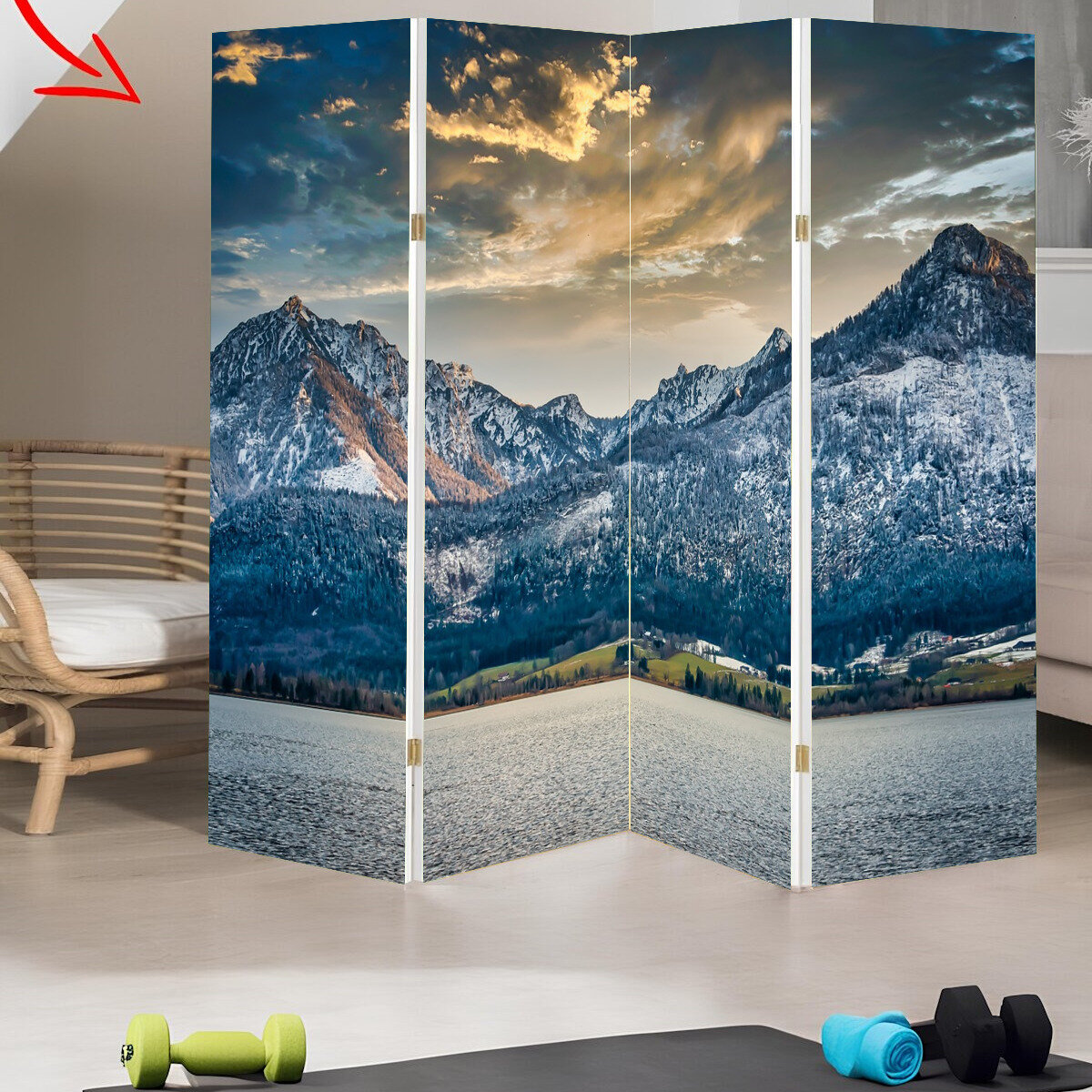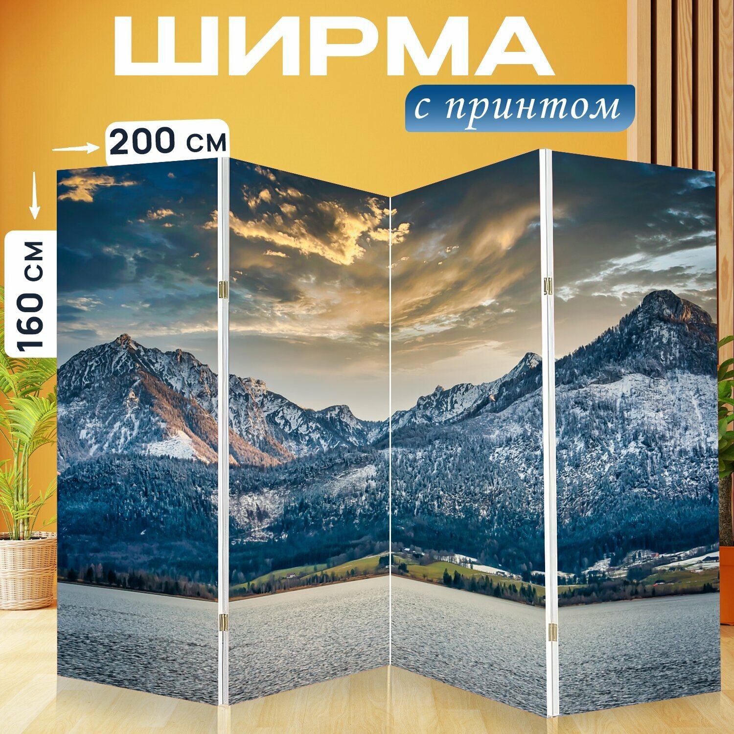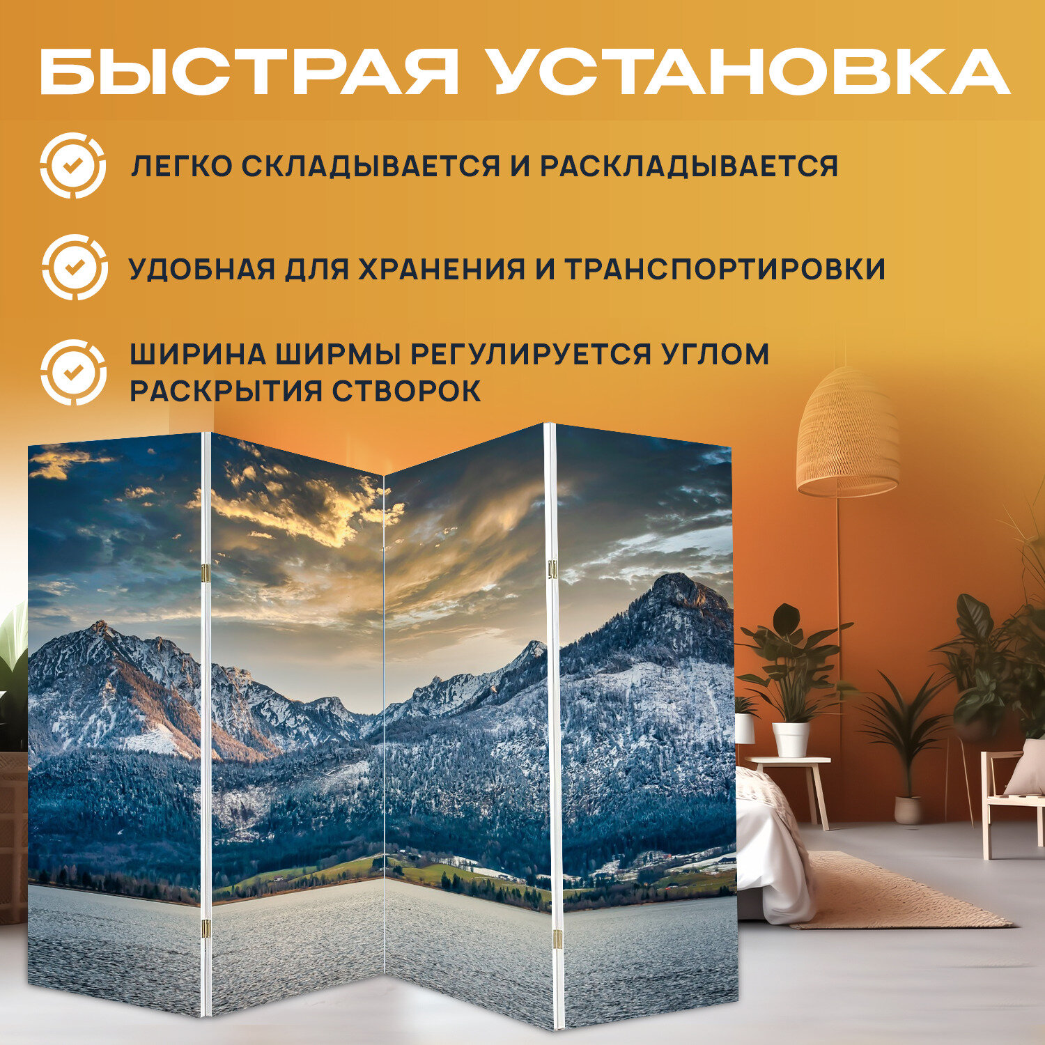 Ширма "Горы, озеро, заход солнца" раскладная перегородка для зонирования с принтом на холсте интересное: