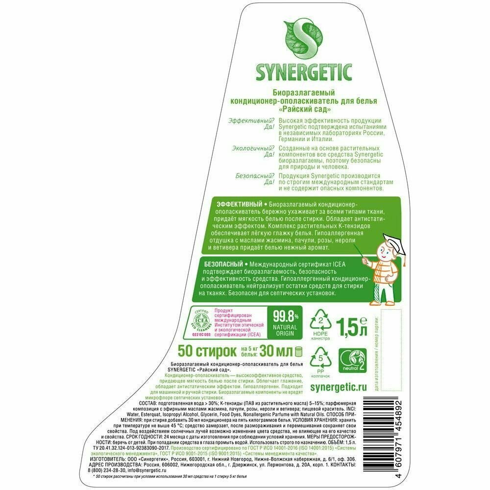 Кондиционер для белья SYNERGETIC 1500мл кондиционер-ополаскиватель для белья Райский сад