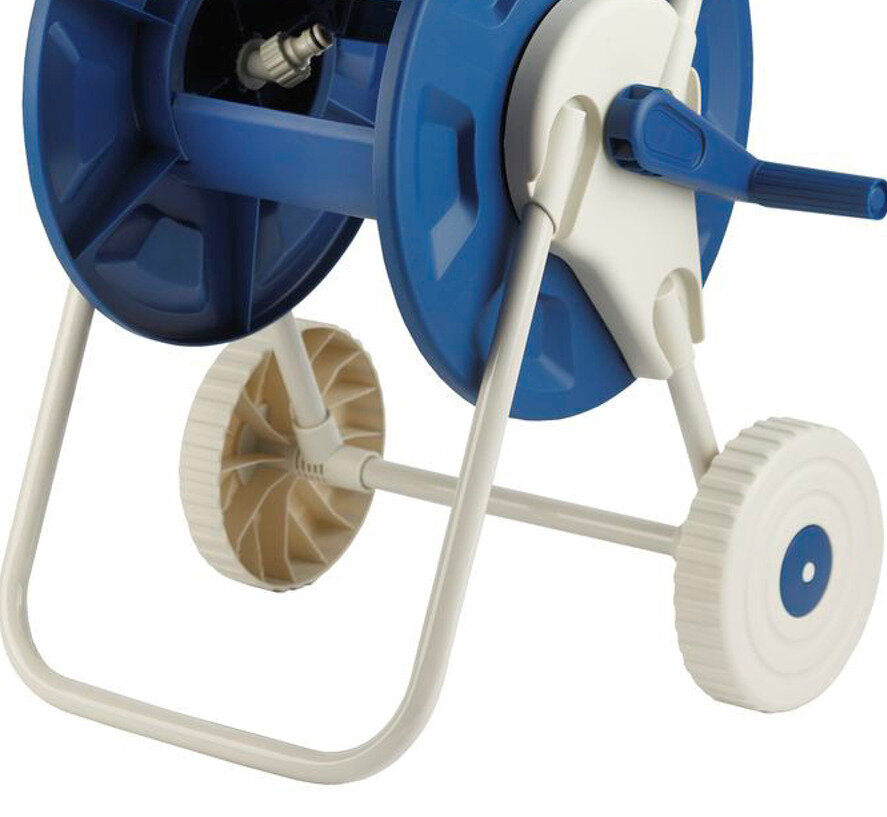 | Минусы: | Конструкция тележки хлипкая и ненадёжная в местах соединения металла с пластиковыми деталями, шланг 3/4 не походит для этой катушки, только 1/2 и подобные да и цена сильно завышена. Нет фиксатора торможения катушки, шланг разматывается. |