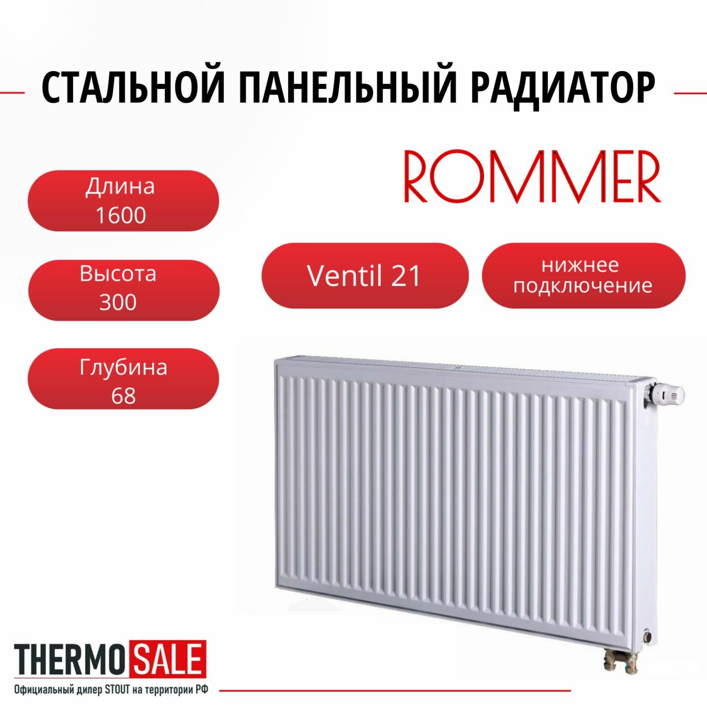 Купить Радиатор стальной панельный ROMMER 300х1600 нижнее правое подключение Ventil 21/300/1600 RRS-2020-213160