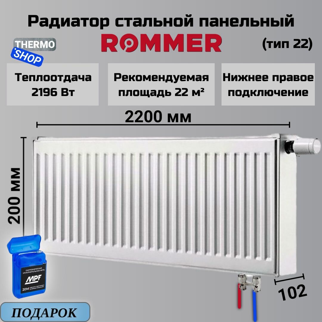 Радиатор стальной панельный ROMMER 200х2200 нижнее подключение Ventil 22/200/2200 Сантехническая нить