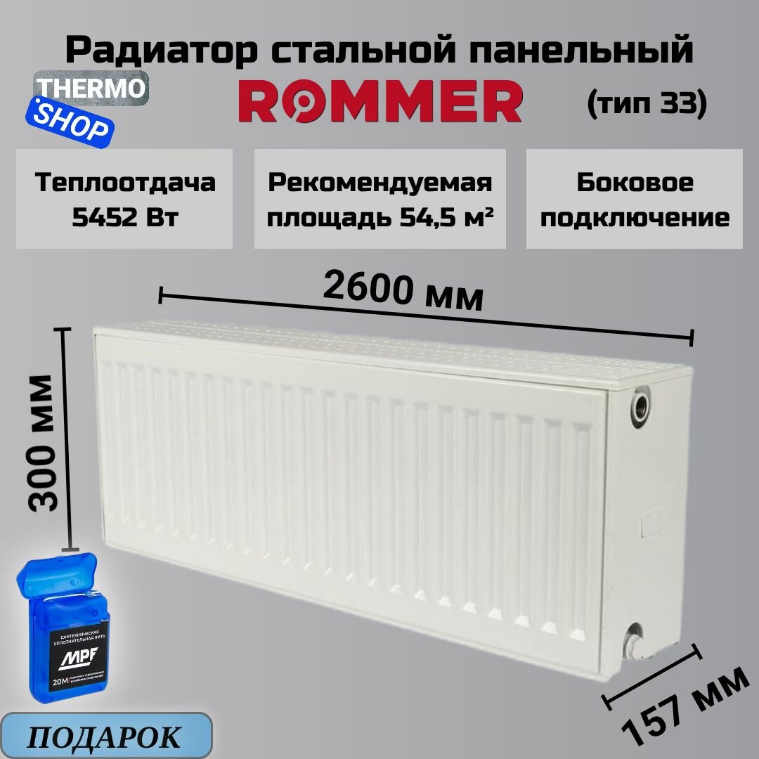 Радиатор стальной панельный ROMMER 300х2600 боковое подключение Compact 22/300/2600 Нить сантехническая