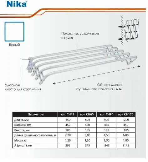 Сушилка для белья NIKA СН60 3м настенная складная металлическая белый цвет