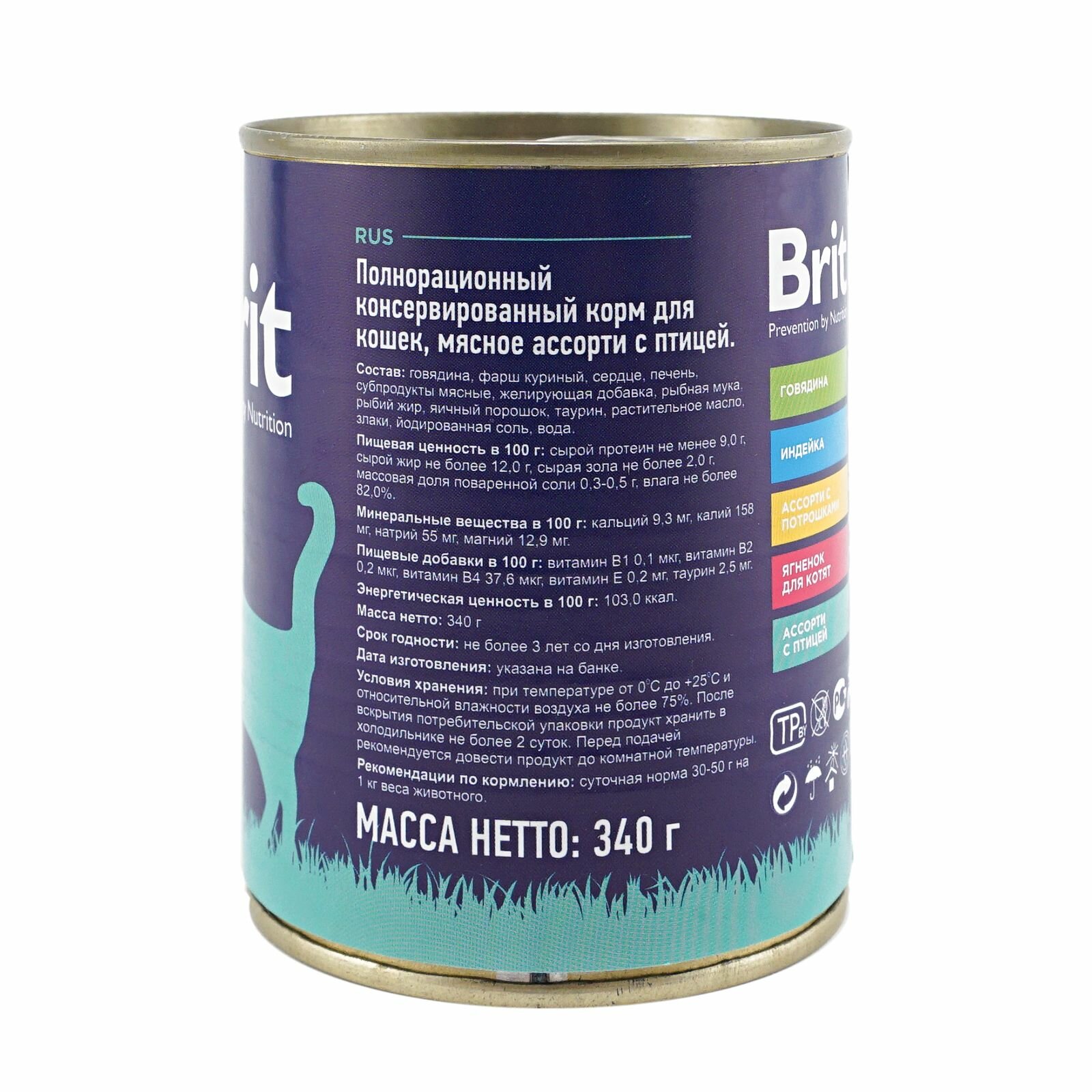 Модификации: Корм для кошек Brit (0.34 кг) 12 шт. Консервы для стерилизованных кошек мясное ассорти с птицей, Корм для кошек Brit (0.34 кг) 1 шт. Консервы для стерилизованных кошек мясное ассорти с птицей, Корм для кошек Brit (0.34 кг) 6 шт. Консервы для стерилизованных кошек мясное ассорти с птицей.