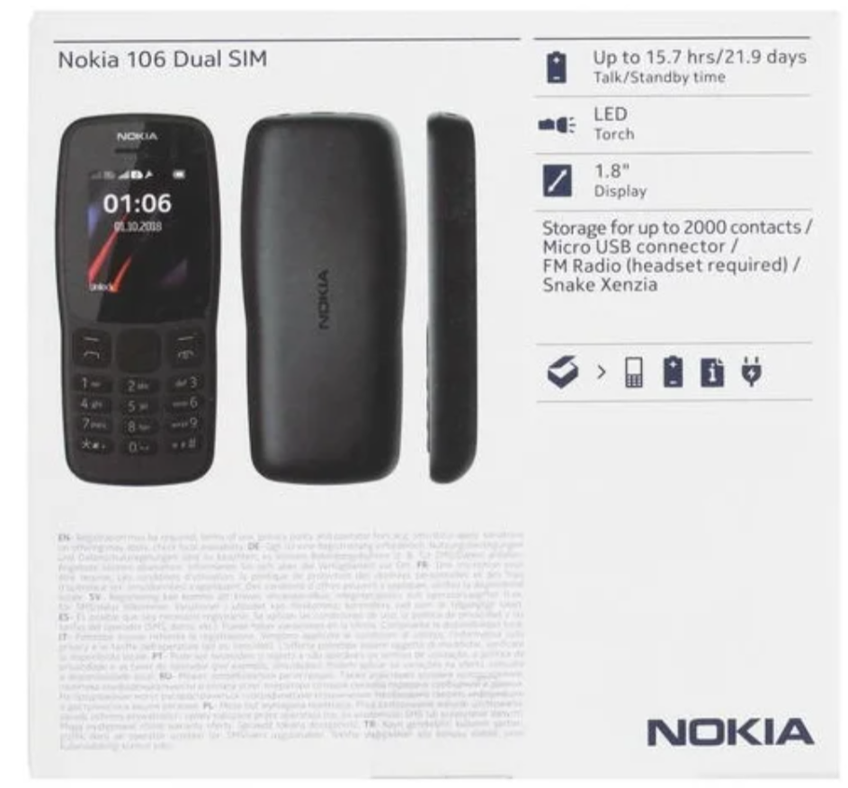 Мобильный телефон Nokia 106 (2018), 2 SIM, черный- надежный и удобный