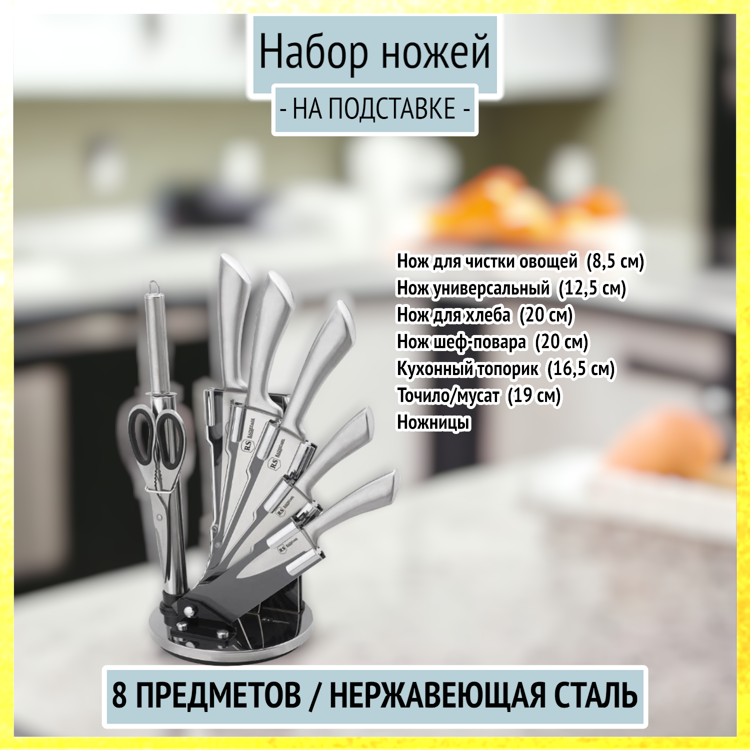 Набор ножей для кухни на подставке Rainstahl из 8 предметов, RS/KN 8001-08